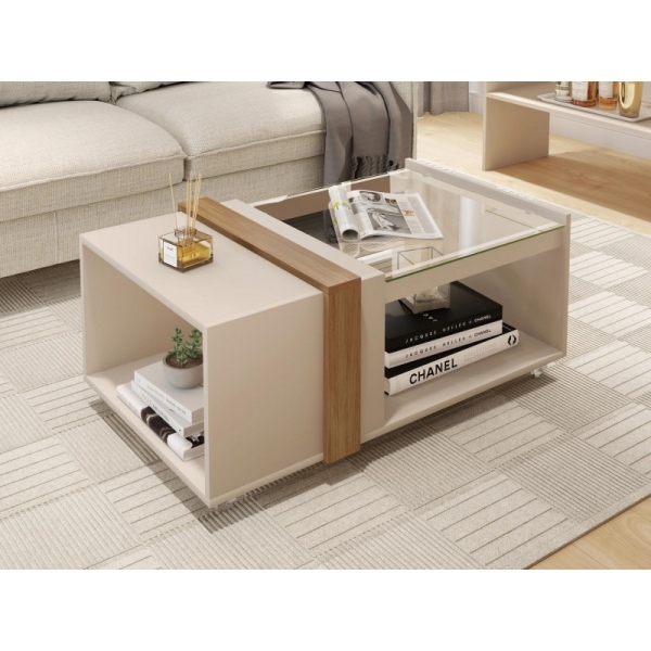 Mesa FRANCIA, baja, cristal, MDP blanco roto y miel, 90,5 x 54 cms