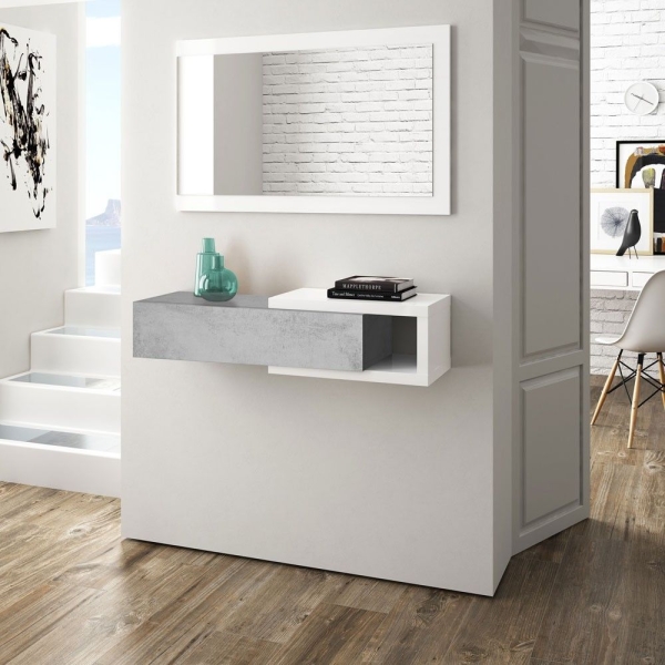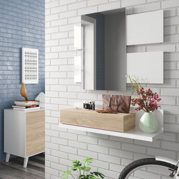 Los muebles de recibidor de entrada modernos que mejor funcionan en 2026 juegan con la suspensión y la ligereza. Al elevar el mueble del suelo (anclado a la pared), engañas al ojo: ves más suelo y la habitación parece automáticamente más grande. Además, te facilitan la vida a la hora de pasar el robot aspirador.