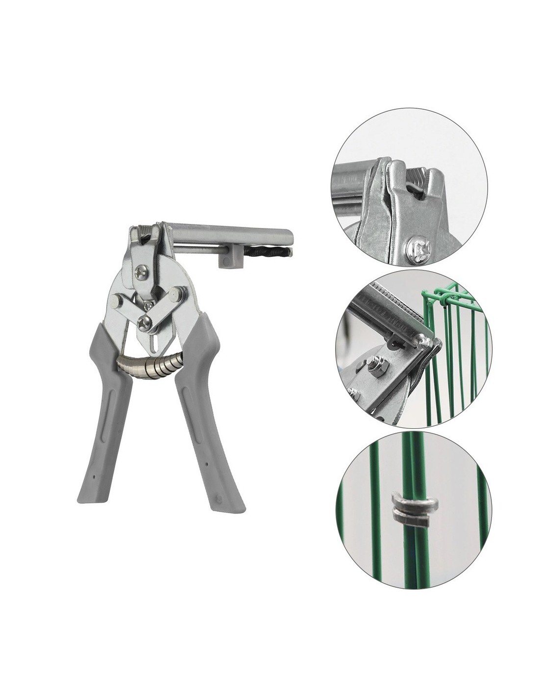 El diseño ergonómico de los mangos de plástico no solo asegura un agarre cómodo, sino que también minimiza el esfuerzo necesario durante la operación. Este alicate es especialmente útil para grapar alambre mallas, enrejados y otras estructuras metálicas, proporcionando una instalación segura y duradera.