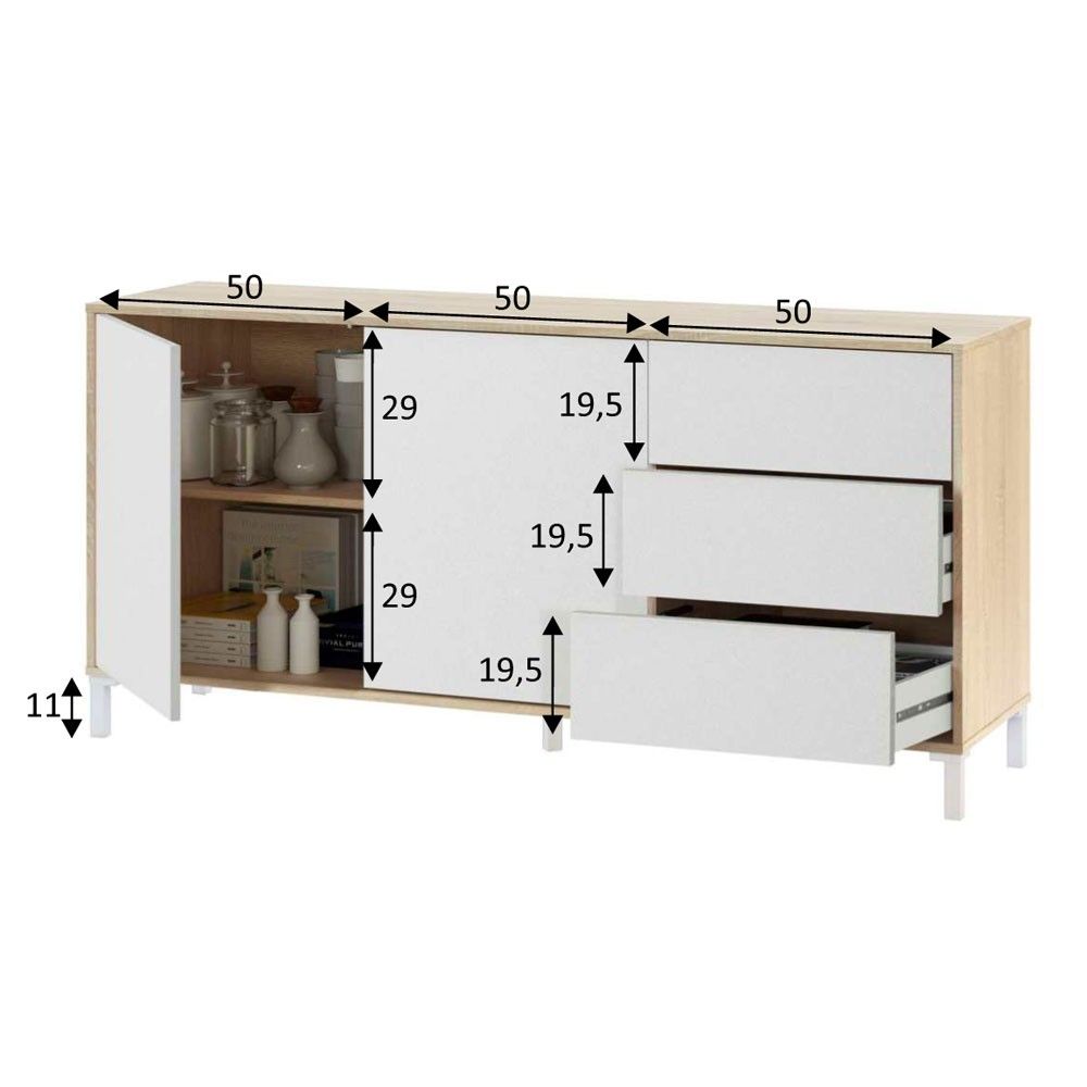 El aparador Brooklyn Bilbao no solo es una pieza estética, sino que también ofrece una solución práctica para organizar tus pertenencias. Con tres cajones de gran capacidad y dos puertas de apertura lateral, podrás almacenar todo lo que necesites sin perder el aspecto limpio del salón.