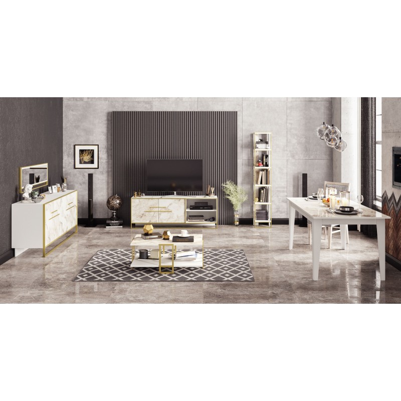 Aparador SIENA, biIaminado mármol blanco con metal dorado, 180 cms.