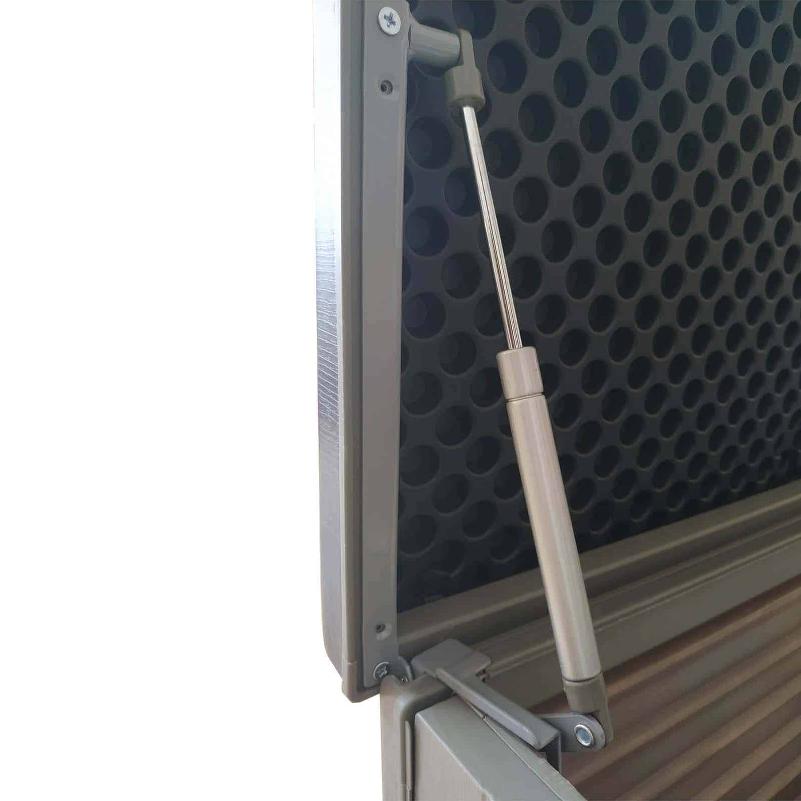 Su diseño innovador no solo resulta atractivo a la vista, sino que también incorpora una parte superior transformable en asiento doble, perfecto para disfrutar de tu terraza o jardín. Además, la pre-instalación para candado (no incluido) te brinda la seguridad necesaria para guardar tus pertenencias con tranquilidad. Los amortiguadores integrados garantizan un cierre y apertura suaves, evitando golpes bruscos y brindándote una experiencia cómoda y segura.