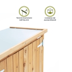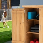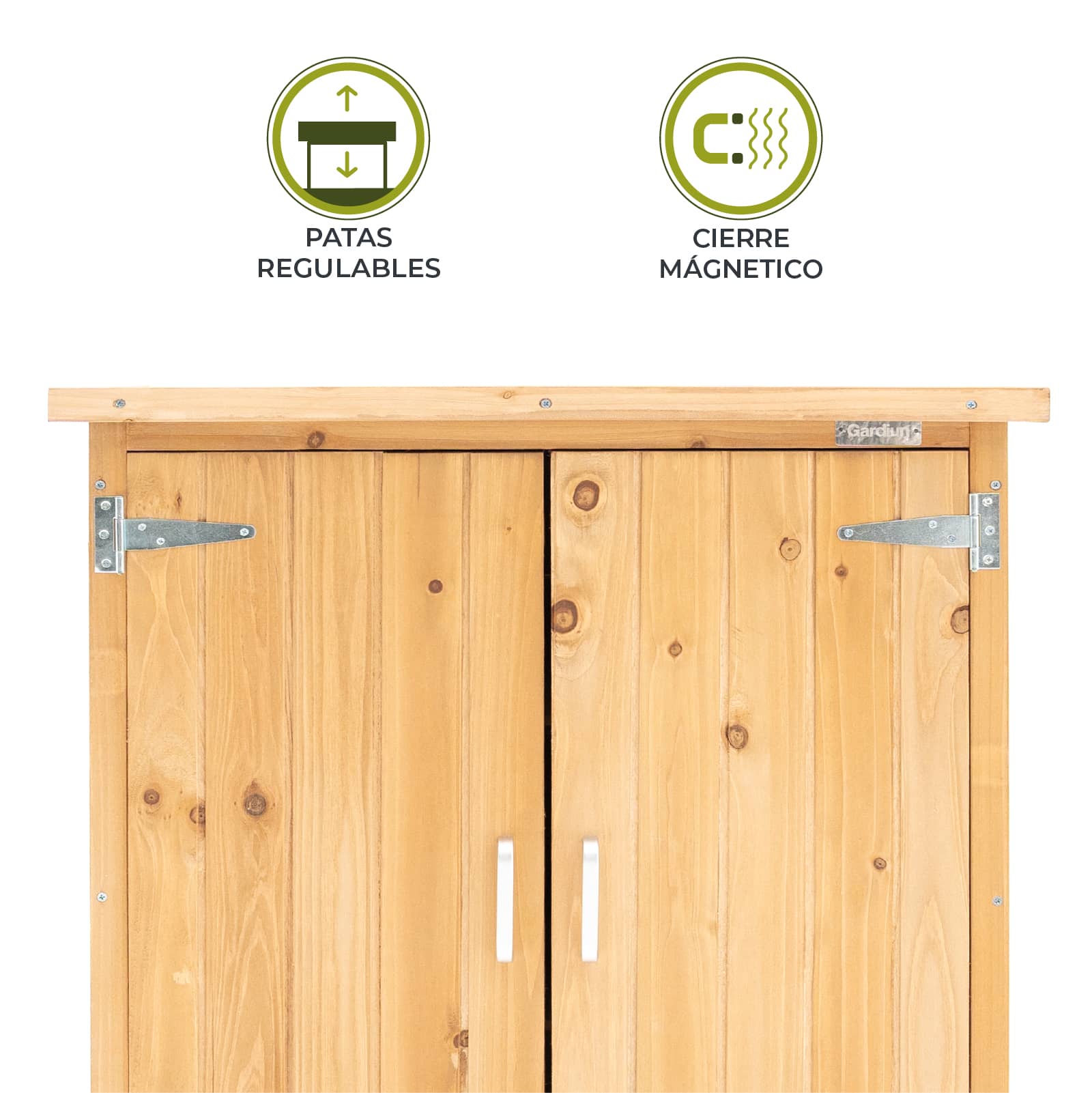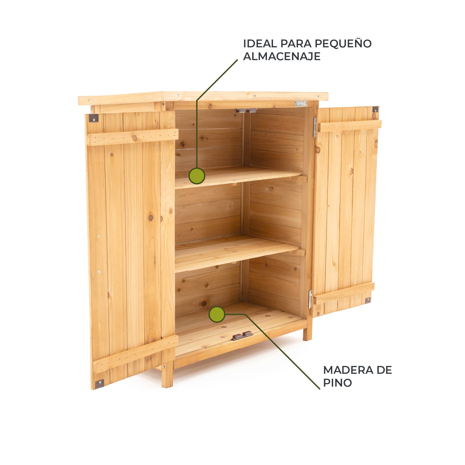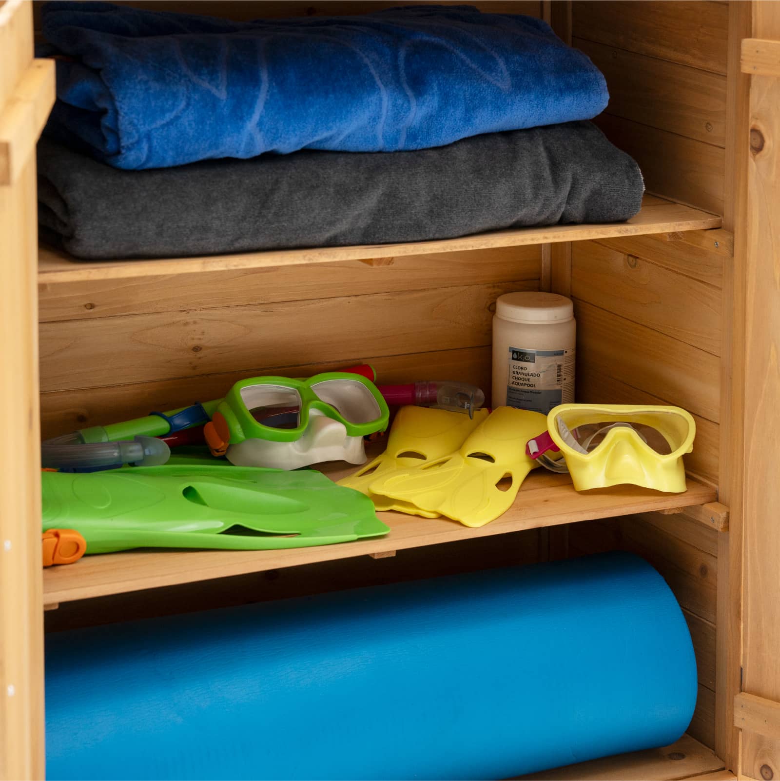 El diseño clásico de este armario, realizado en madera de pino, se adapta a cualquier jardín, patio o zona de piscina. Sus tres áreas de almacenamiento te ayudarán a mantener todo ordenado y accesible, ideal para quienes valoran la organización y el estilo en su espacio exterior.