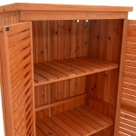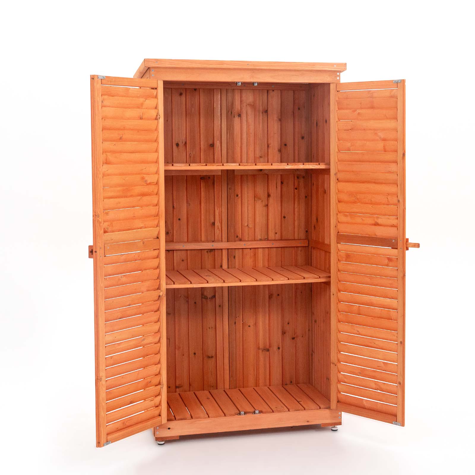 Su puerta abatible de doble hoja tipo persiana permite una buena ventilación y un acceso fácil y cómodo a tus pertenencias. La estructura de madera y el techo plano con recubrimiento de tela asfáltica lo preparan para estar en zonas exteriores cubiertas, como patios, balcones o jardines. Aunque se recomienda aplicar un tratamiento impermeabilizante adicional si va a estar expuesto directamente al sol o la lluvia, prolongando así su durabilidad.