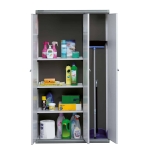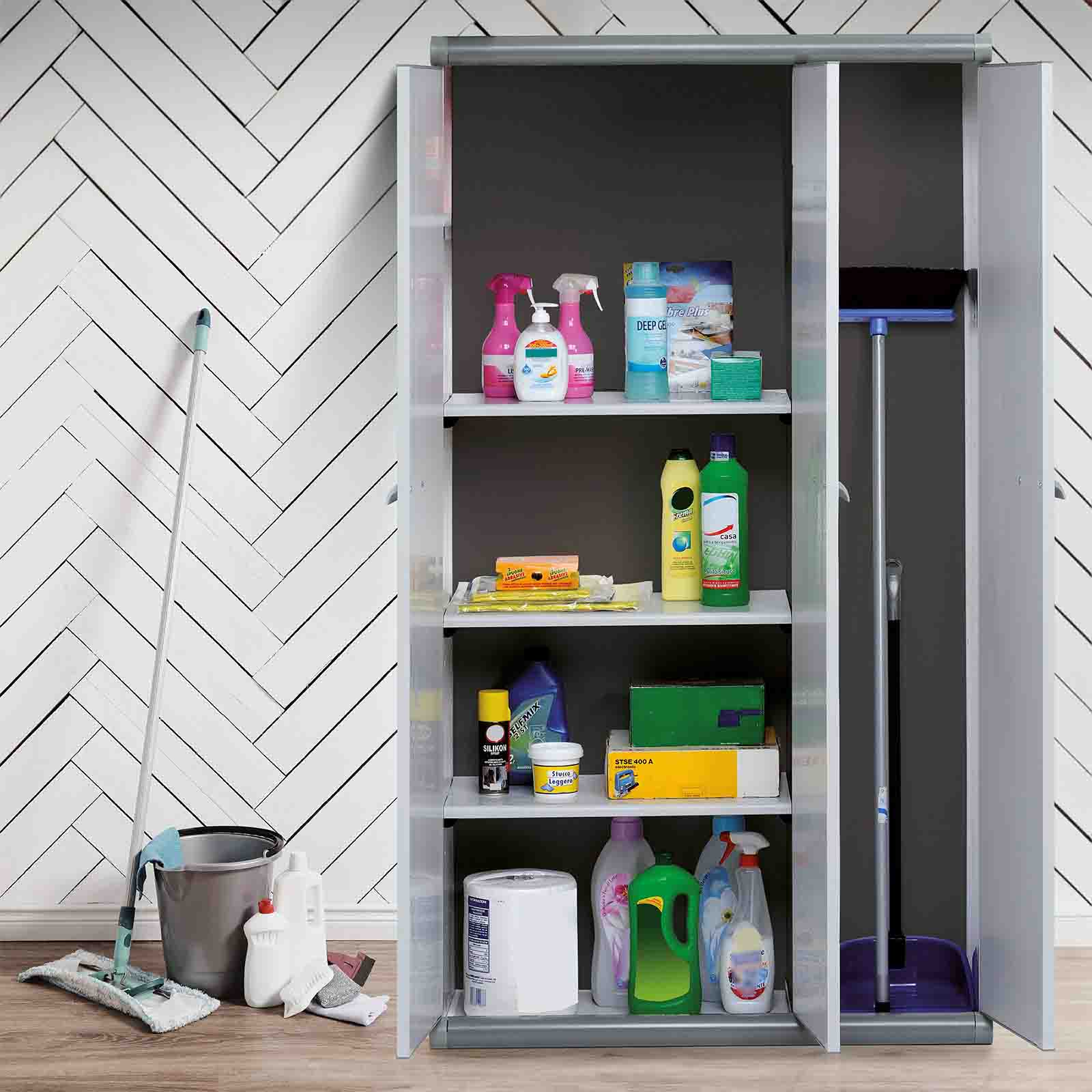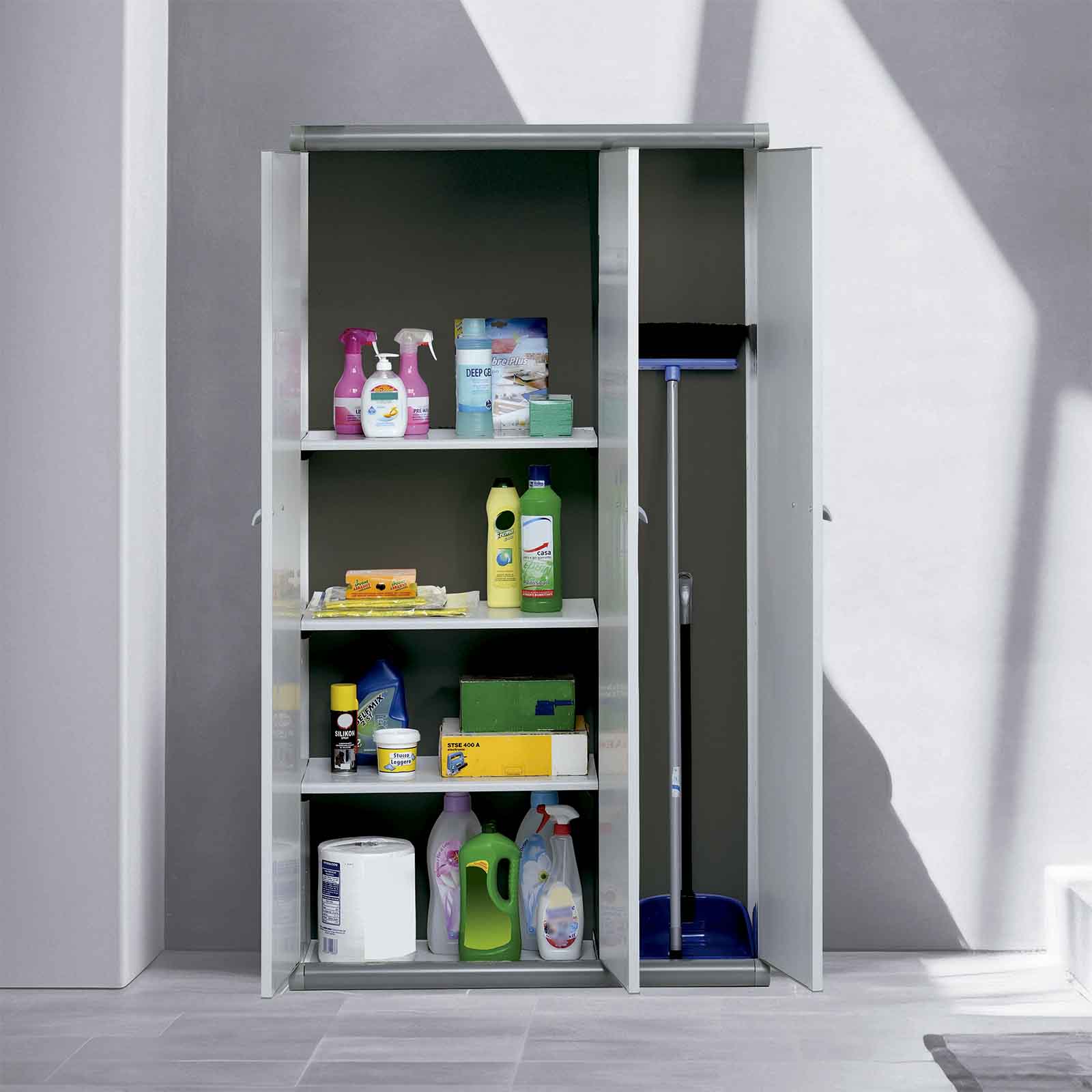 Este armario cuenta con tres estantes regulables que soportan hasta 20 kg cada uno, permitiendo una organización flexible según tus necesidades. Sus tres puertas abatibles con tiradores facilitan el acceso al interior y ofrecen la posibilidad de añadir un candado (no incluido) para mayor seguridad. Además, incorpora una zona de escobero para organizar productos de limpieza u otros objetos de gran tamaño.