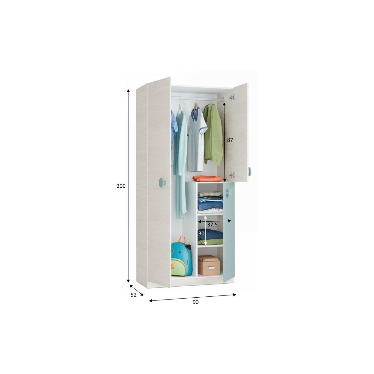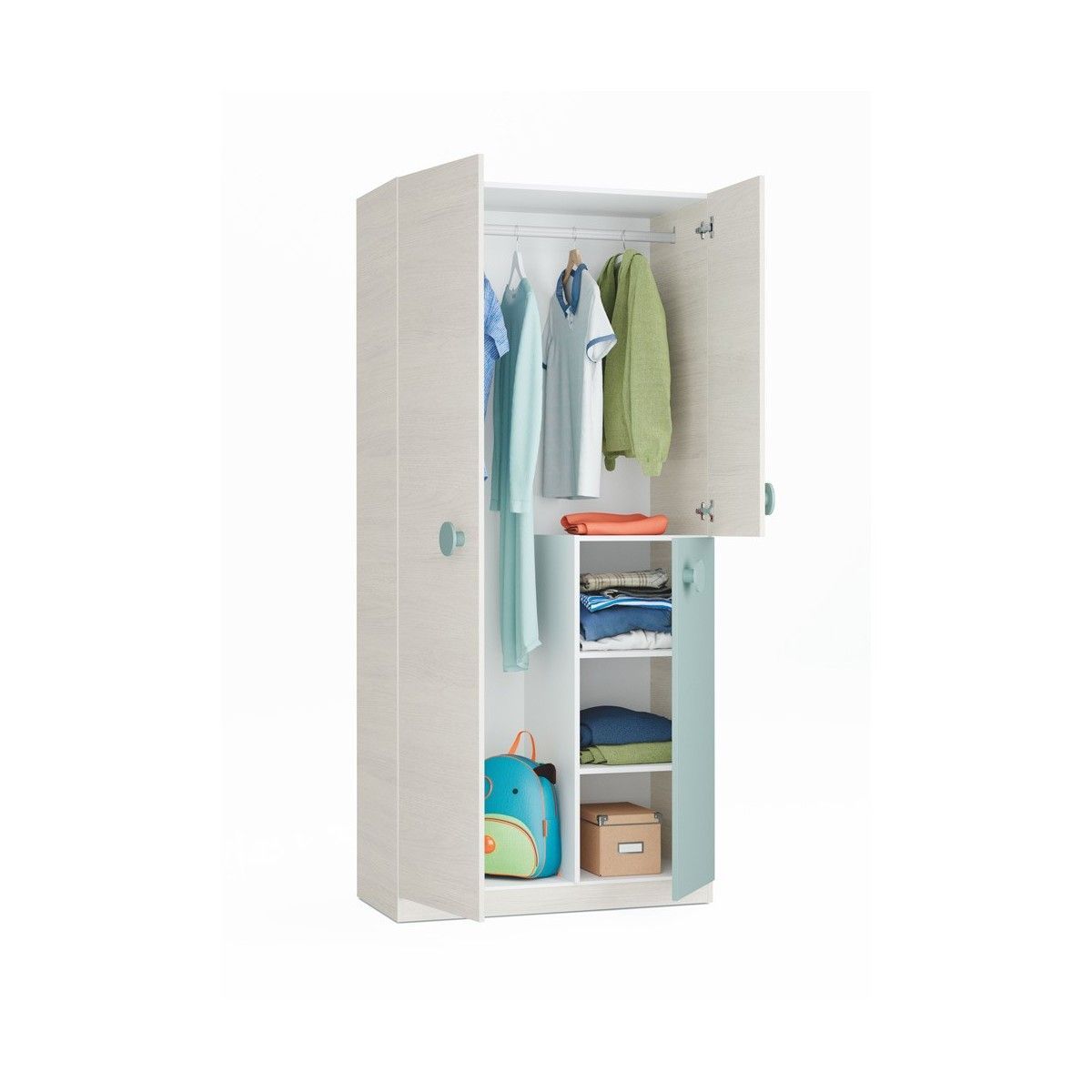 Descubre el armario Snuba, un ropero para dormitorio juvenil que combina estilo y funcionalidad. Su diseño en blanco Alpes con toques verdes Acqua le da un aspecto fresco y moderno a tu habitación.