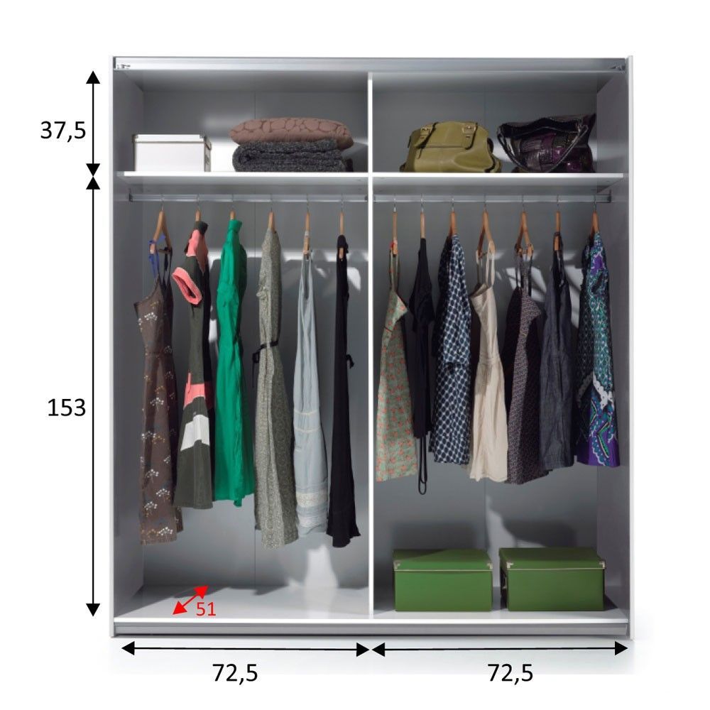 Espacio optimizado: Con una distribución interior thoughtfully diseñada, el armario Arya cuenta con dos estantes superiores y barras extraíbles de aluminio para colgar ropa. Además, las medidas totales de 150 cm de ancho, 200 cm de alto y 60 cm de fondo te permiten aprovechar al máximo el espacio disponible en tu dormitorio.