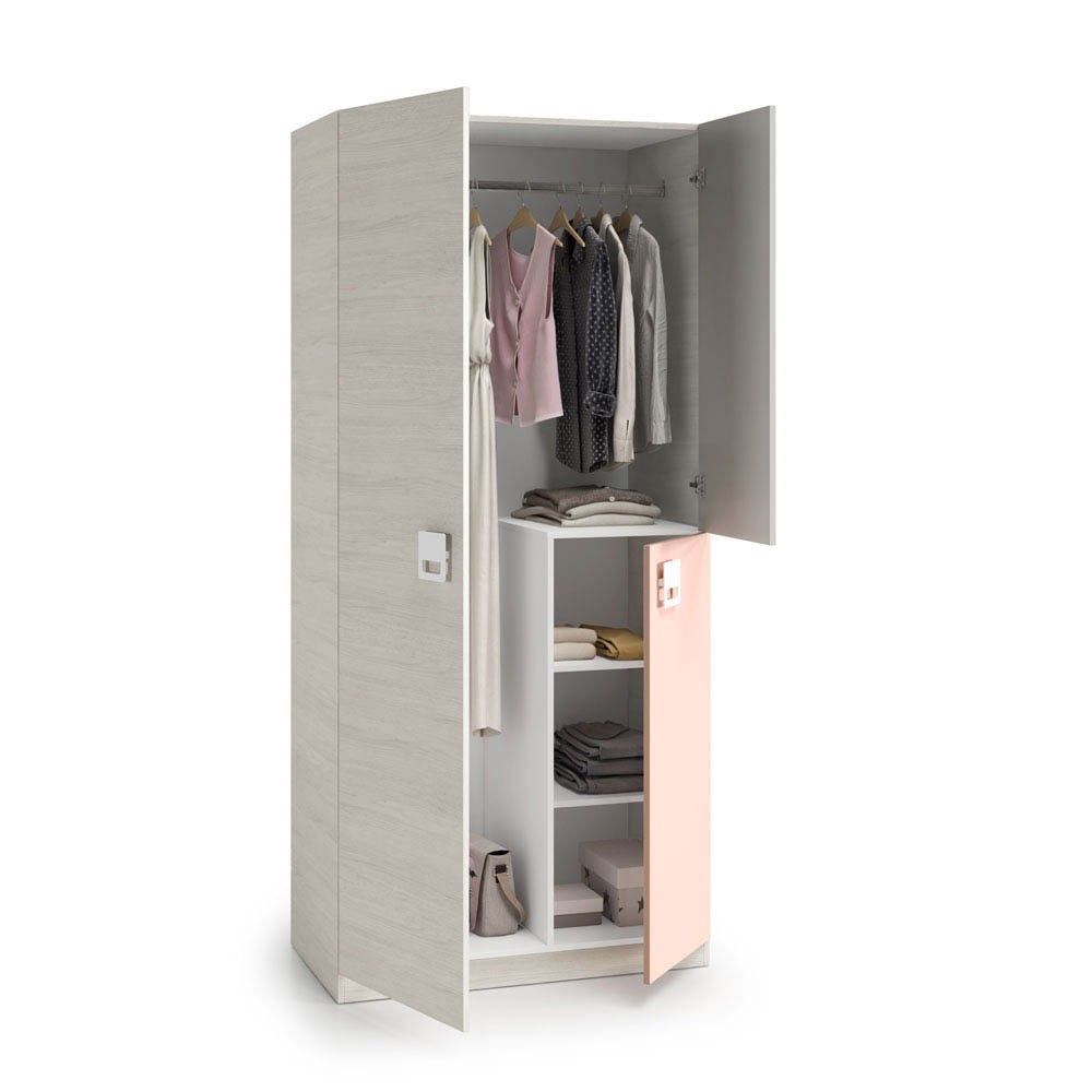 El armario juvenil New Nube se presenta en un elegante acabado de color blanco Alpes, rosa y gris. Los tiradores son de ABS en color blanco, proporcionando una estética moderna y funcional que se adapta a cualquier estilo de decoración.