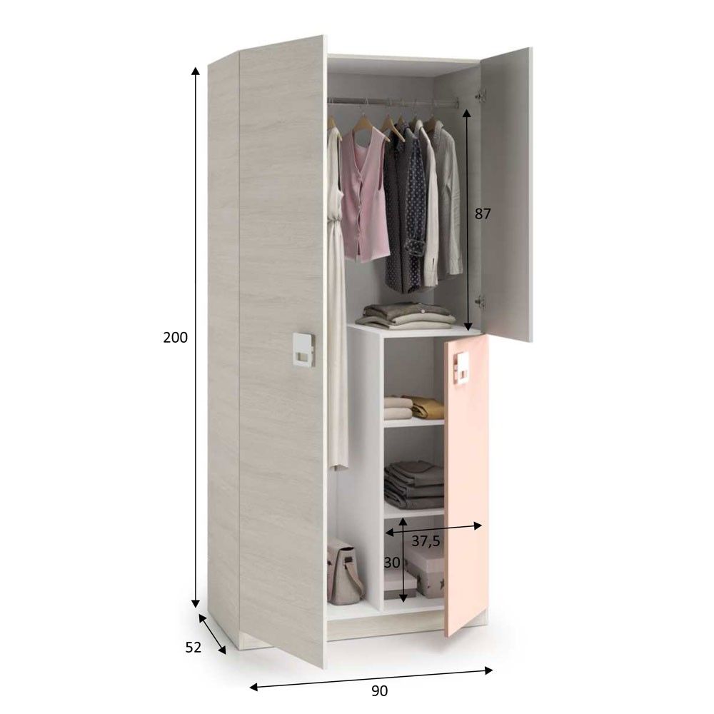 Con medidas de 90 cm (ancho) x 52 cm (fondo) x 200 cm (alto), este armario es perfecto para espacios reducidos, permitiendo maximizar el espacio en la habitación de tus hijos sin sacrificar la funcionalidad.