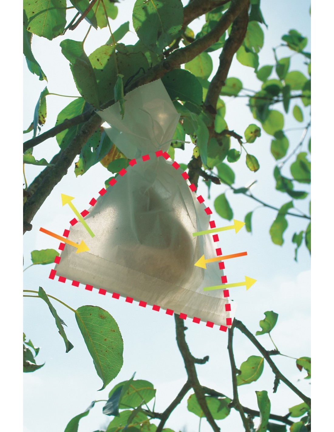 Aplique Fruitsac directamente sobre cada fruto o racimo, asegurándose de que esté bien sujeto y no impida el flujo natural del aire. Para un mejor resultado, aplíquelas desde la primavera para permitir un crecimiento óptimo sin interferencias externas.