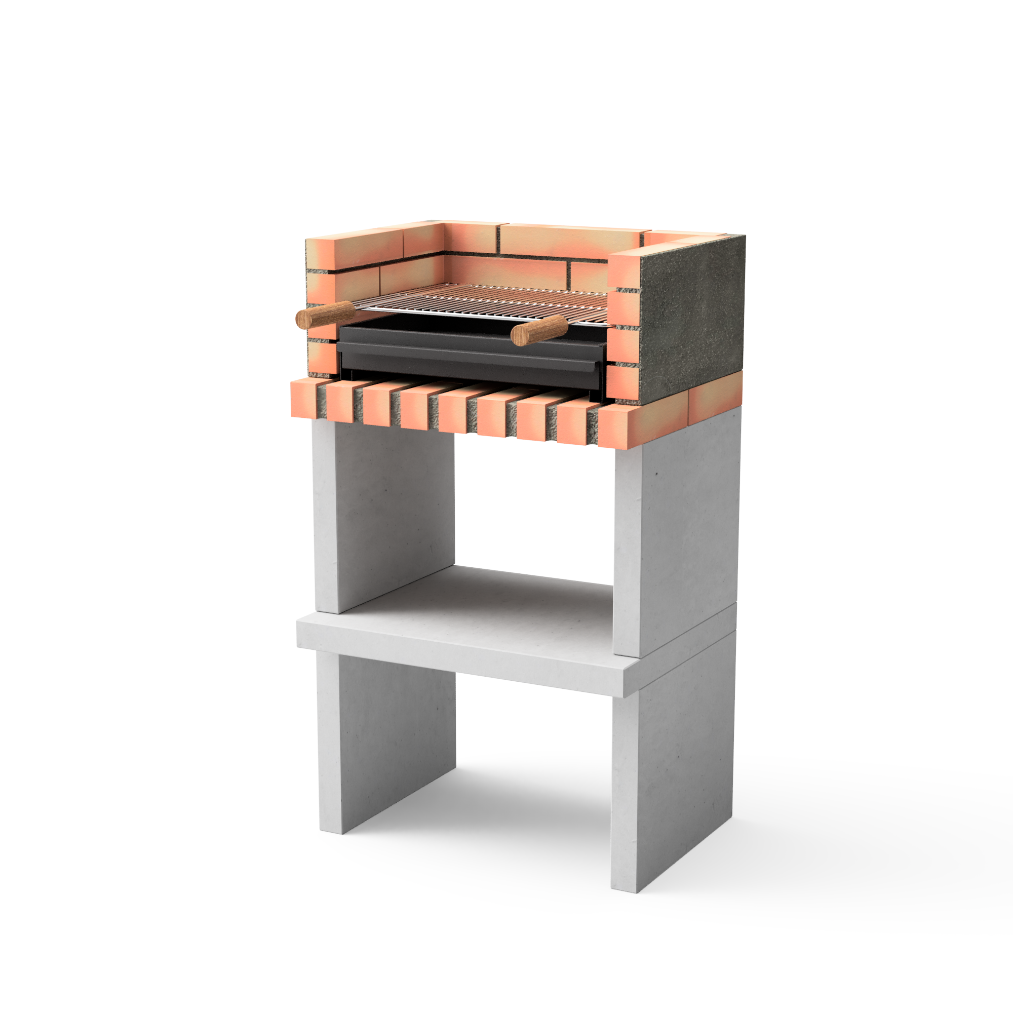 Fabricada con hormigón refractario gris y ladrillo naranja claro, combinando resistencia y estilo.