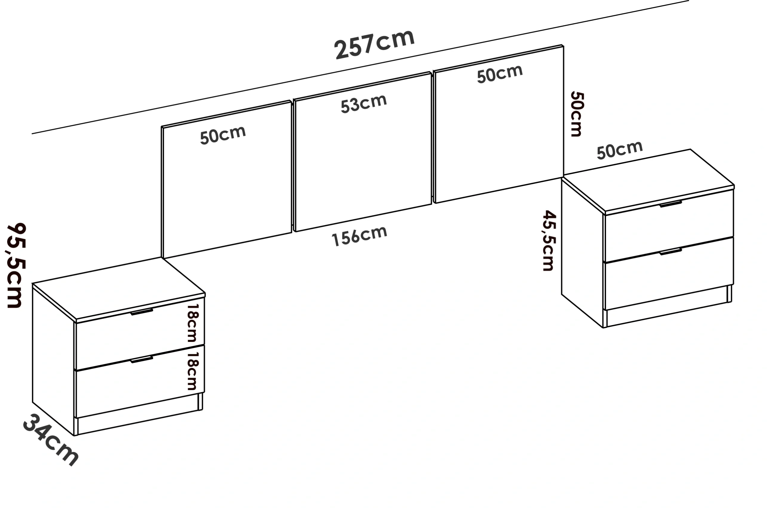 - Dos Mesitas de Noche con Dos Cajones: Acompañando al cabecero, se incluyen dos mesitas de noche, cada una con dos amplios cajones. Estas mesitas proporcionan un espacio de almacenamiento generoso y discreto para guardar tus objetos personales, libros, dispositivos electrónicos o cualquier cosa que desees tener a mano antes de dormir, manteniendo tu superficie libre de desorden.
