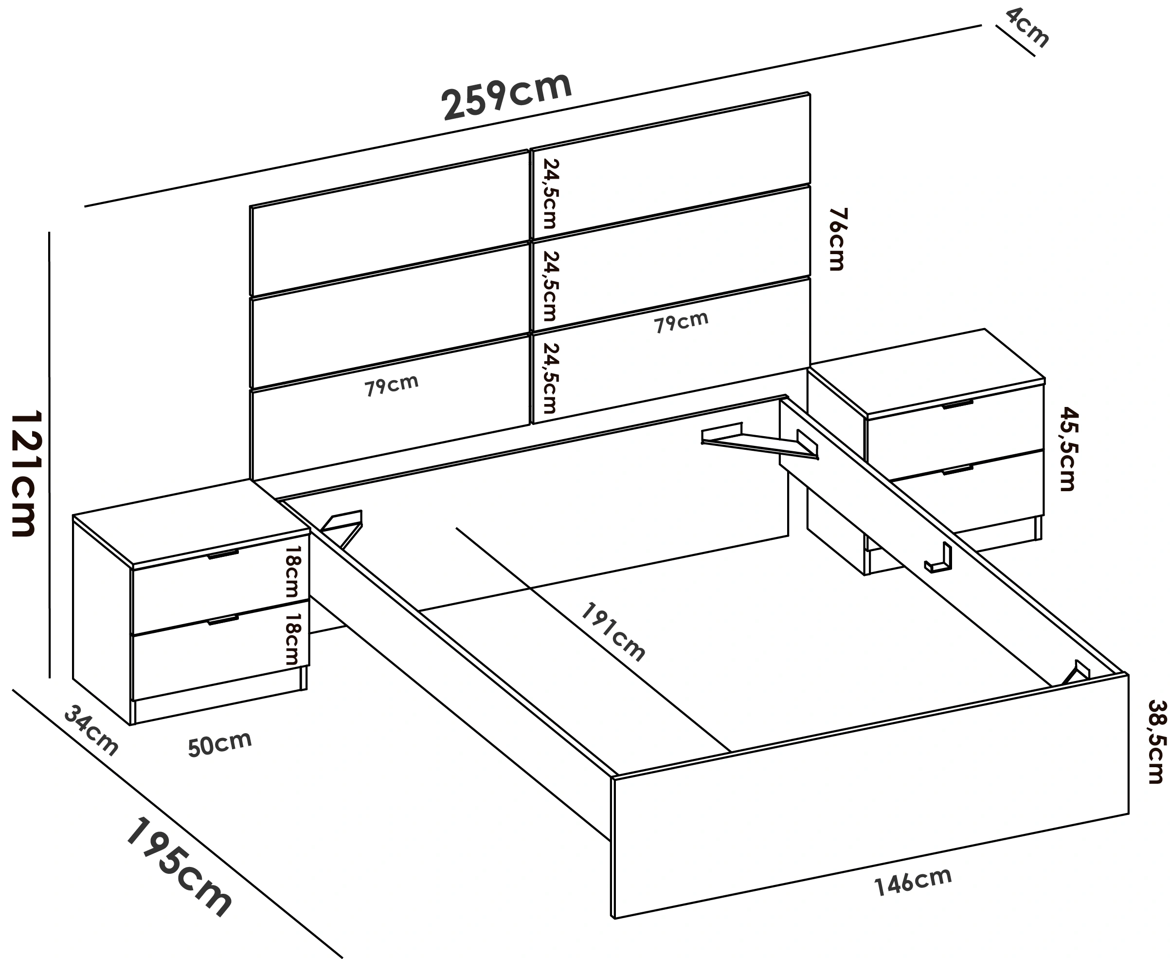 Cama de Matrimonio Con 2 Mesitas 2 cajones y Cabecero Astra 135/140x190cm