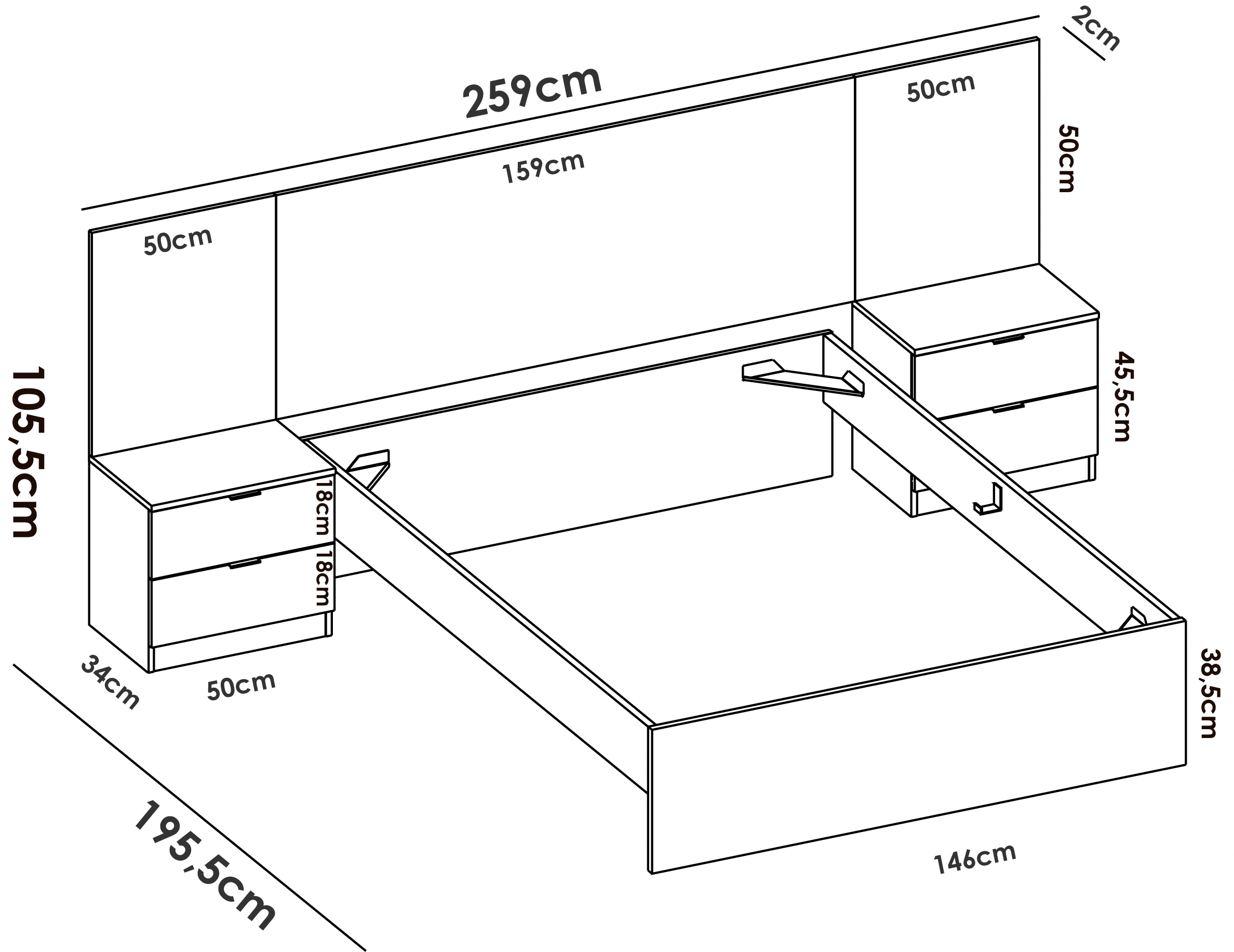 Cama de Matrimonio Con 2 Mesitas 2 cajones y Cabecero Loma 135/140x190cm