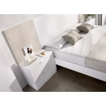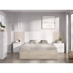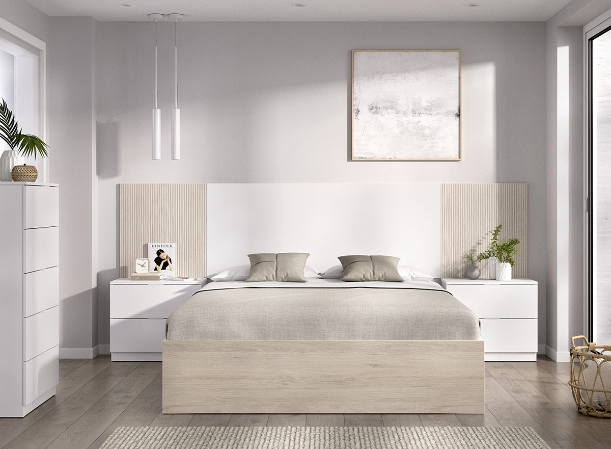 - Blanco Mate Central y Mesitas: El cabezal cuenta con un elegante centro en Blanco Mate, y las mesitas de noche son completamente en blanco. Esto irradia luminosidad y frescura, creando una base neutral.