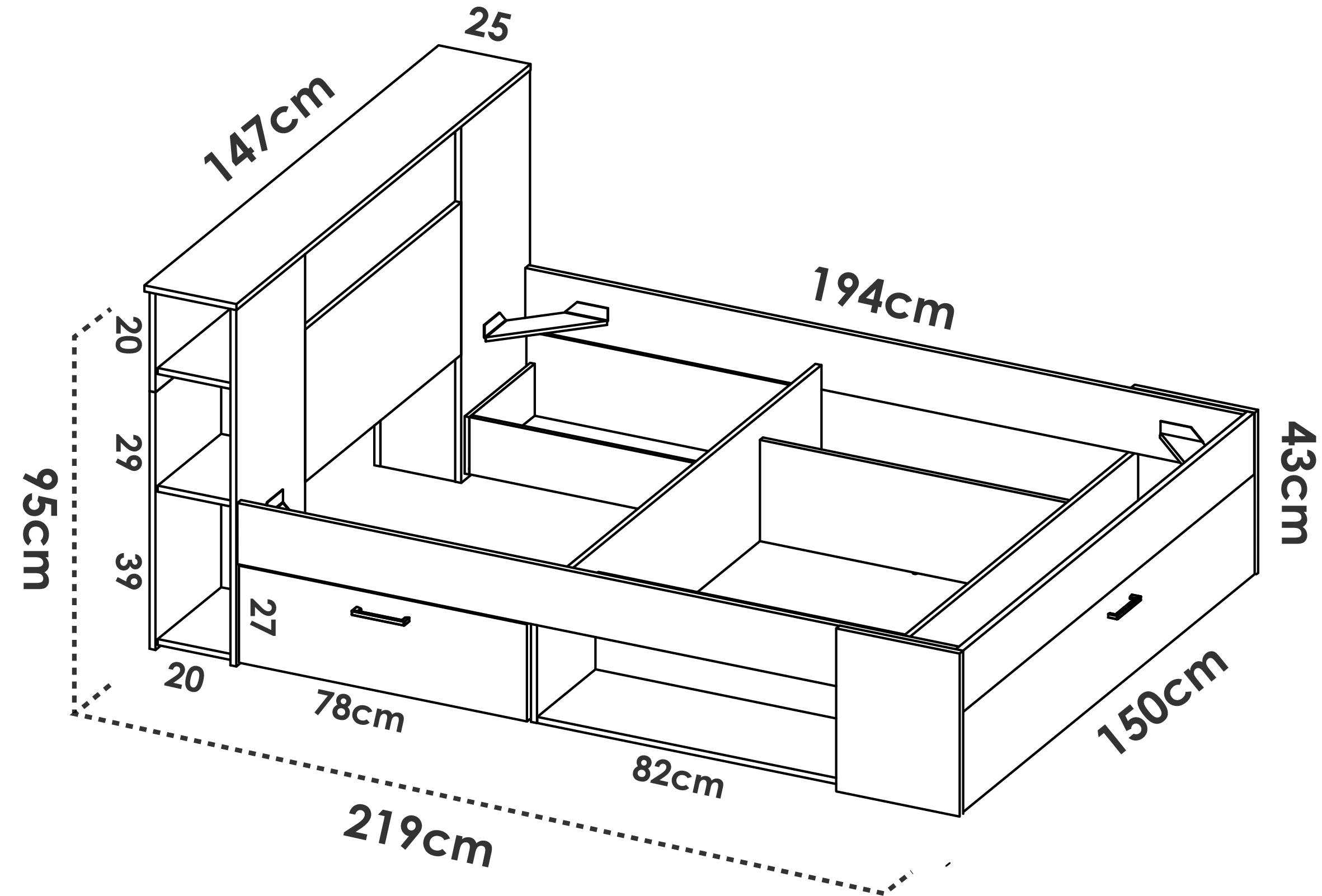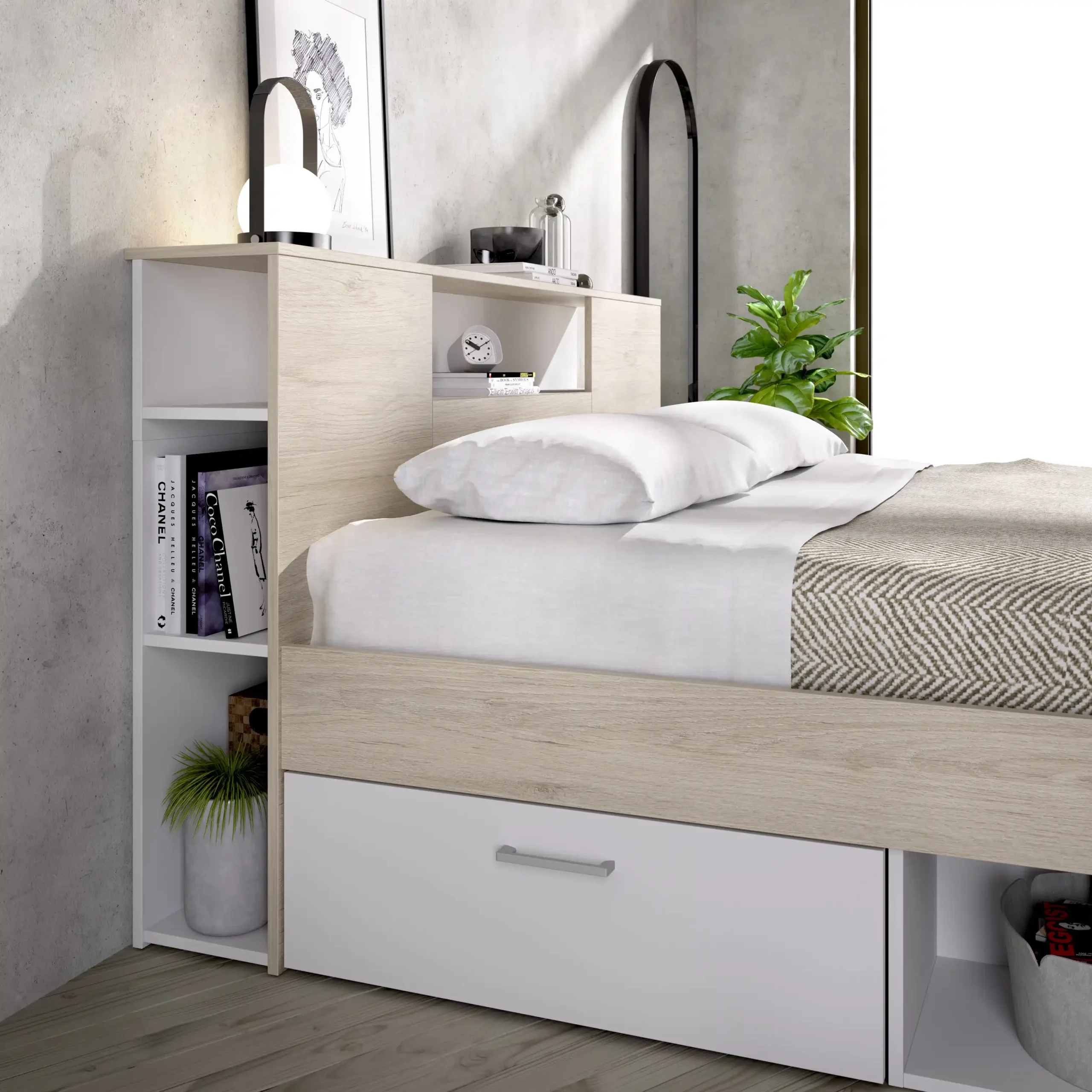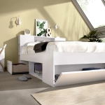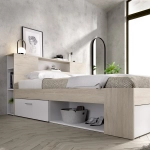 La cama LANKA destaca por su diseño moderno y minimalista. Una de sus características clave es el cabecero-estantería integrado, que elimina la necesidad de mesitas de noche, liberando un valioso espacio en el dormitorio. Este cabecero es perfecto para colocar libros, lámparas o cualquier objeto que quieras tener al alcance de la mano.