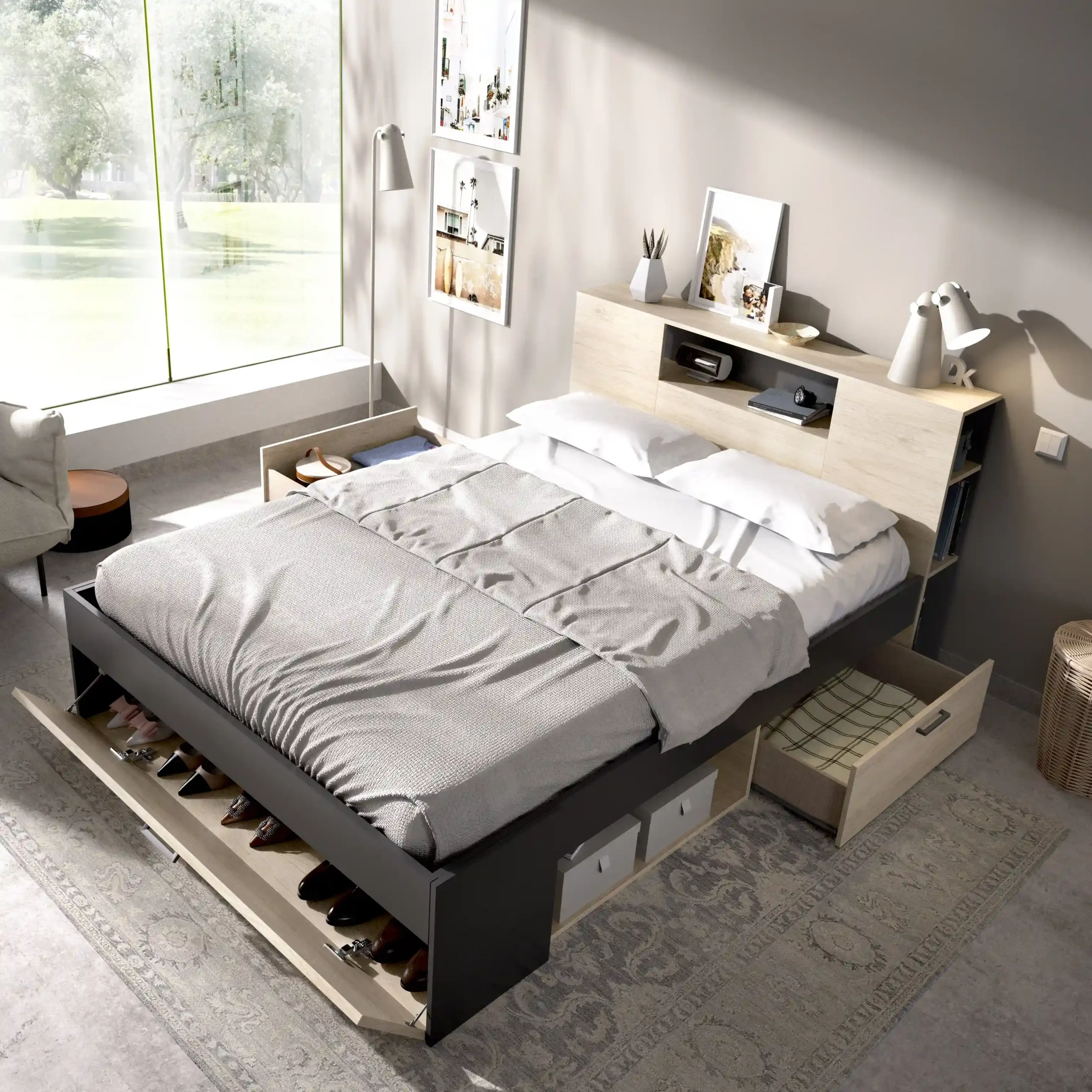 - Compartimentos bajo la cama: Tendrás espacio extra para guardar ropa de cama, mantas o cualquier otro artículo del hogar, manteniéndolo fuera de la vista y maximizando la organización.