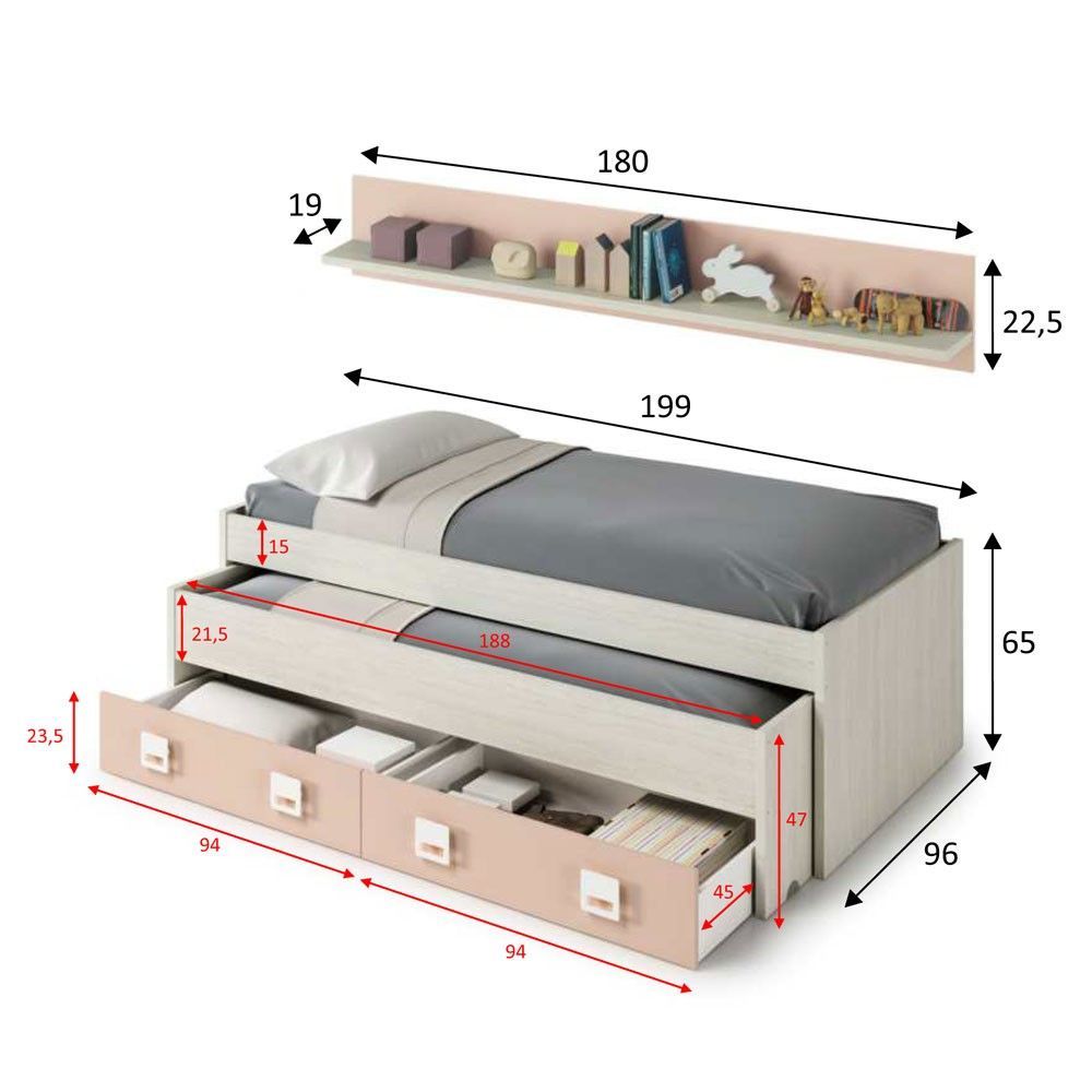 - Cama nido: 199 cm (ancho) x 65 cm (alto) x 96 cm (fondo)