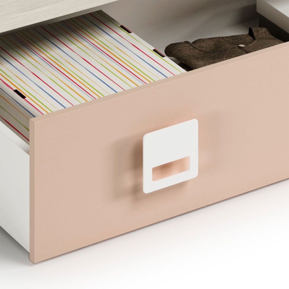 Nuestra cama nido New Nube combina estilo con funcionalidad. Su acabado en blanco Alpes le da un aspecto elegante y sofisticado, mientras que los tiradores ABS en color blanco añaden un toque de modernidad. Los cajones y el estante son en color rosa, proporcionando una apariencia fresca y juvenil.
