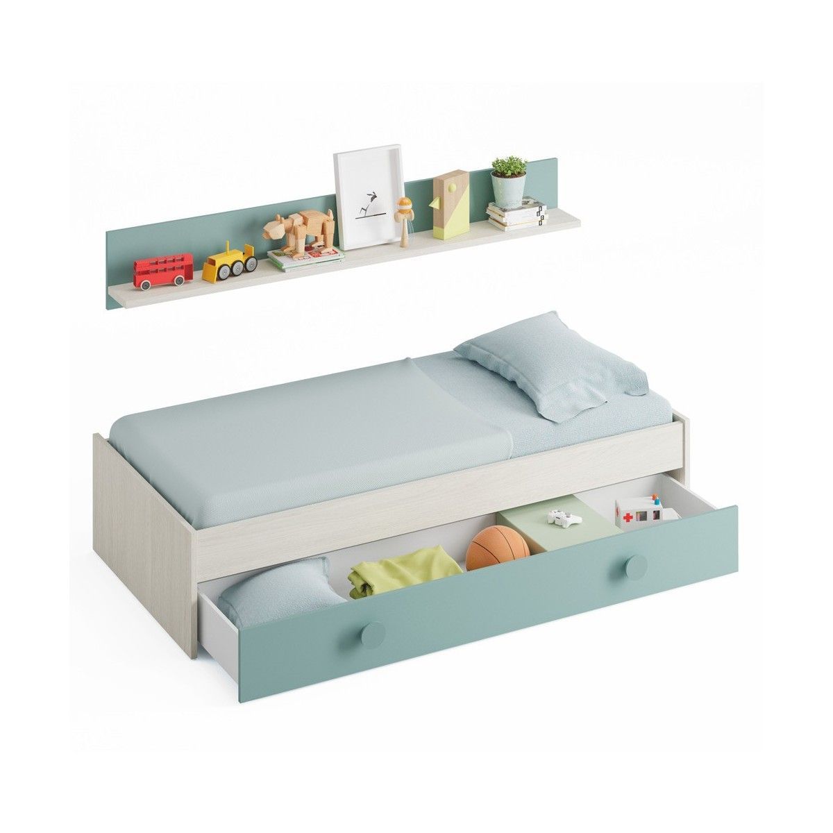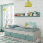 La cama nido juvenil Snuba es perfecta para habitaciones juveniles o infantiles. Con un diseño moderno, incluye un cajón inferior con ruedas ocultas que actúa como cama auxiliar si se le añade un colchón o como espacio de almacenamiento. Fabricada en tablero melaminizado en color Blanco Alpes y Verde Acqua, destaca por su resistencia y estilo desenfadado.