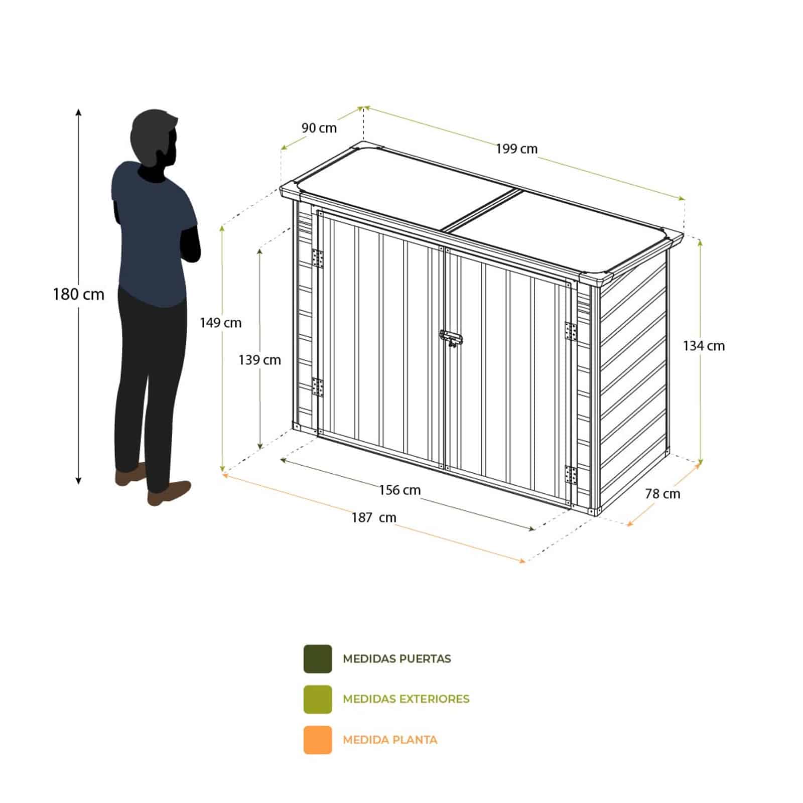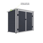 La caseta tipo cobertizo Noa, con sus paredes fabricadas en polipropileno resistente a los rayos UV y al agua, ofrece una protección excepcional contra las inclemencias del tiempo. Su estructura de acero zincado garantiza la durabilidad y solidez del cobertizo, mientras que el techo inclinado evita la acumulación de lluvia, manteniendo tus pertenencias secas y seguras.