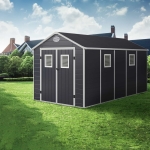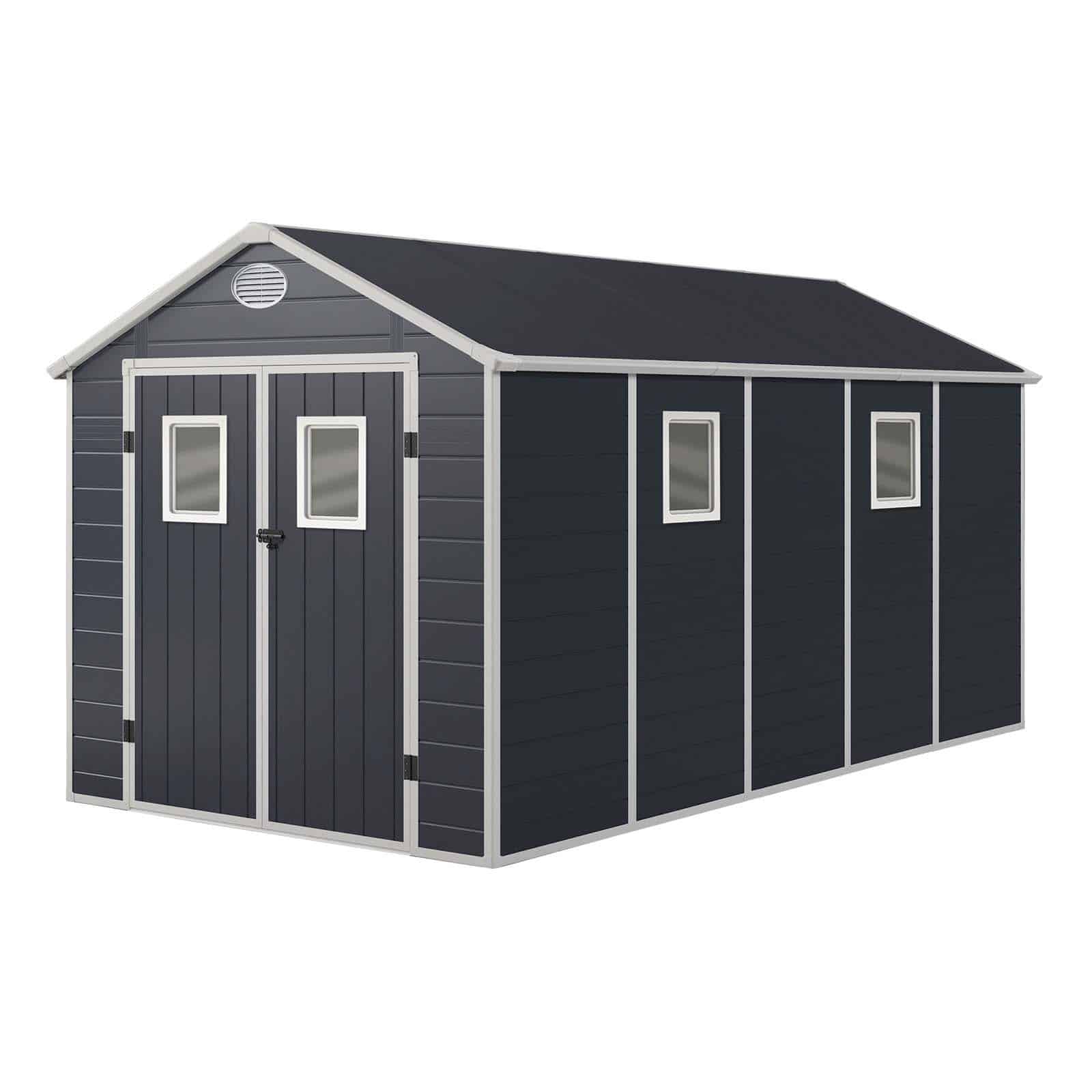 Su diseño moderno en gris antracita se integra fácilmente en cualquier tipo de jardín, aportando un toque de elegancia sin ser demasiado llamativo. La puerta doble abatible con cerrojo preparado para candado (no incluido) te permite asegurar el acceso y mantener tus herramientas o objetos protegidos.