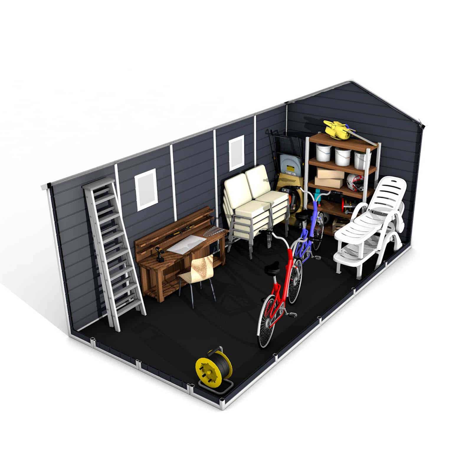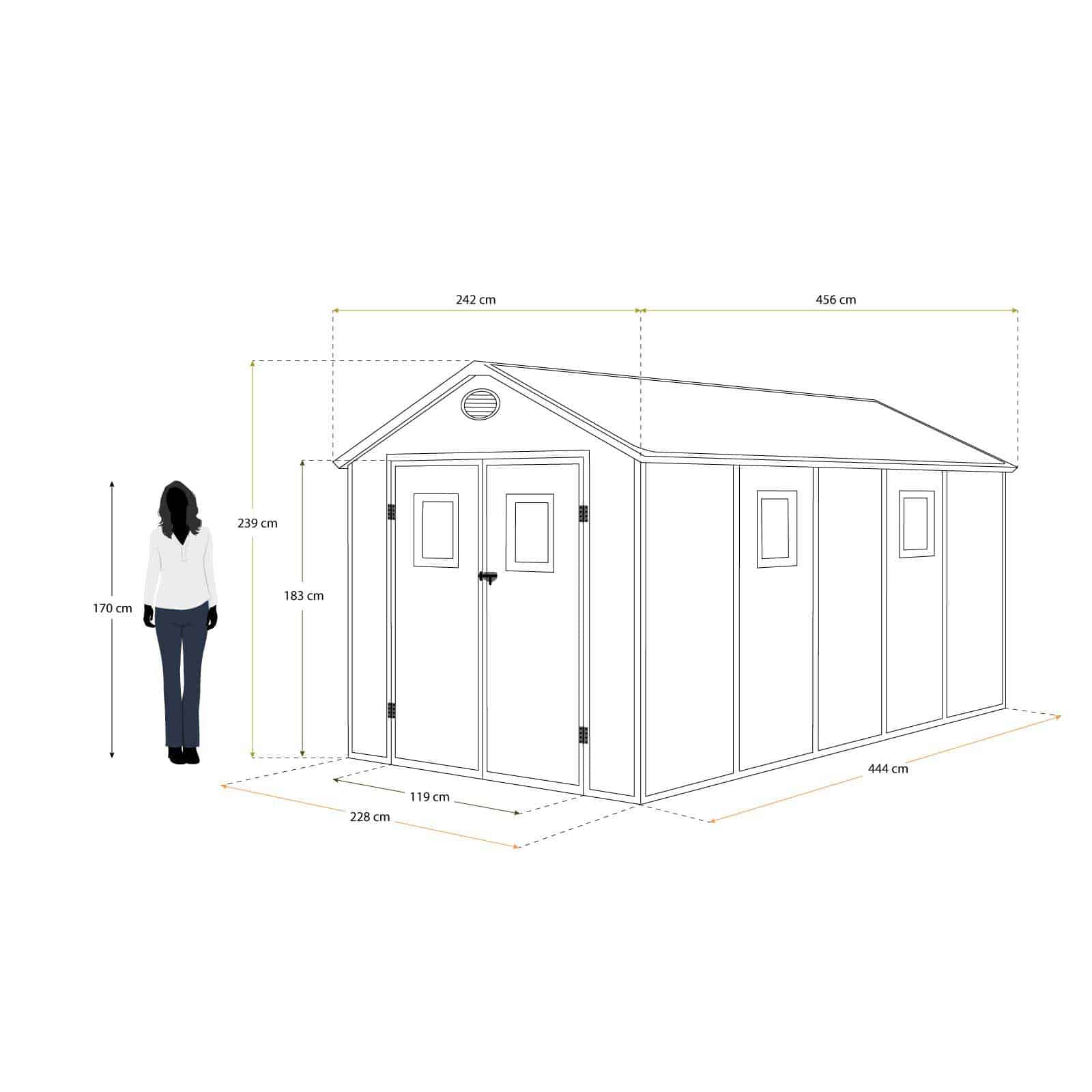 Con una superficie útil de 11,04 m² (interior 228×444 cm), la caseta Zoe E ofrece un espacio amplio para guardar tus utensilios de jardín, maquinaria o cualquier otro material. Sus dimensiones exteriores son de 242x456x239 cm (LxAnxAl).