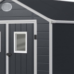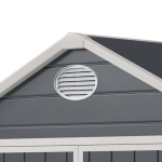 Para una mayor iluminación natural, la caseta Zoe E cuenta con seis ventanas de policarbonato: dos integradas en la puerta y cuatro laterales. Además, un respiradero superior favorece la circulación del aire, evitando la humedad y la formación de moho. Una característica destacada es su suelo incorporado de resina, que protege tus herramientas y objetos almacenados de la humedad directa del terreno, prolongando su vida útil y facilitando su limpieza.