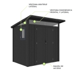 Disfruta de una óptima ventilación gracias a una ventana abatible de policarbonato y a una panorámica frontal y lateral que permite la entrada de luz natural. La puerta principal amplia con rampa y bisagras de doble capa preensambladas facilita el acceso incluso para equipos de gran tamaño.