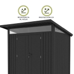 La caseta de jardín modelo Harz es un refugio resistente y funcional para tus herramientas y equipos. Fabricada con acero galvanizado de 0,40 mm de grosor, su armazón de acero zincado garantiza una larga vida útil frente a la corrosión. El techo a un agua previene la acumulación de lluvia, manteniendo tu espacio seco y protegido.