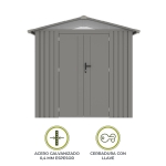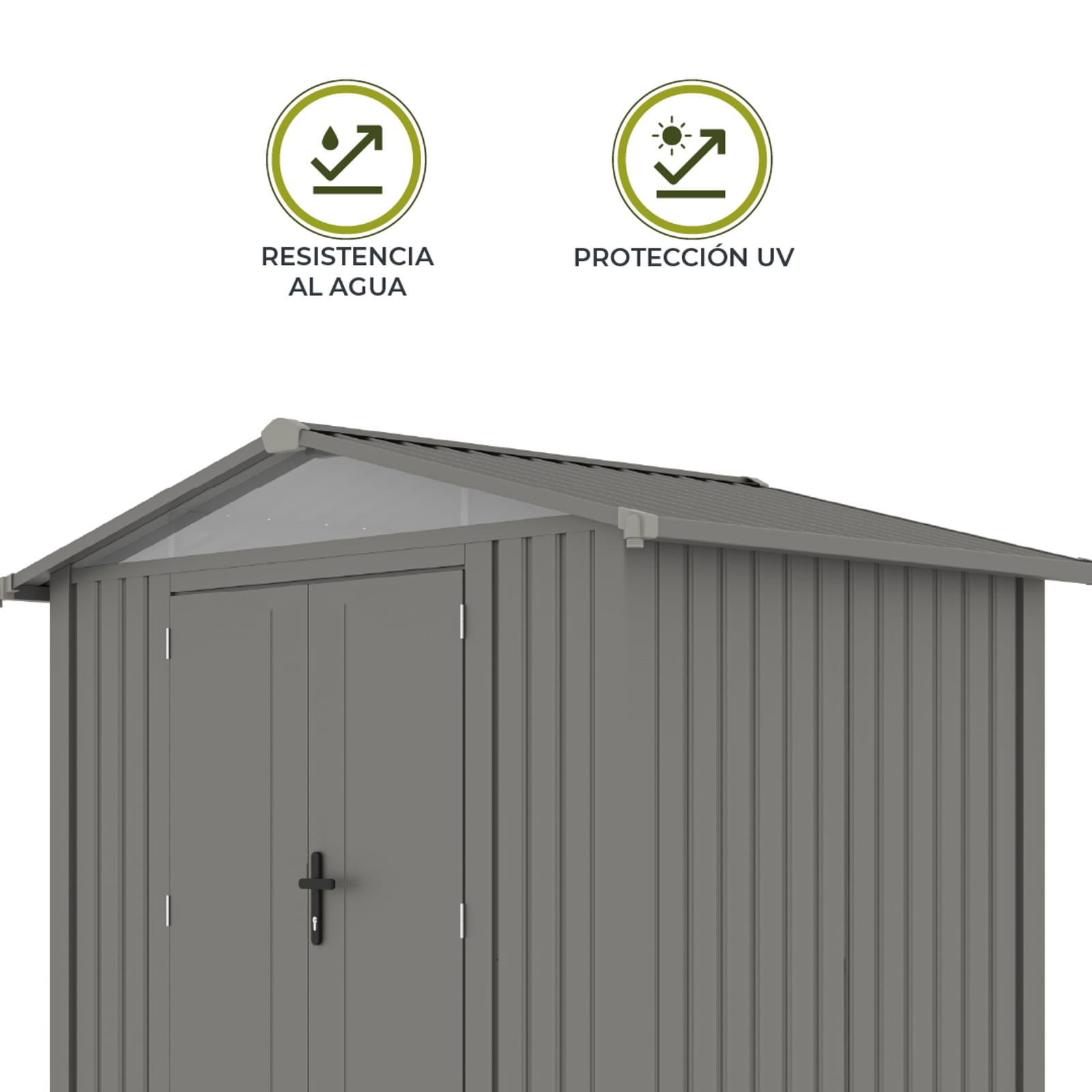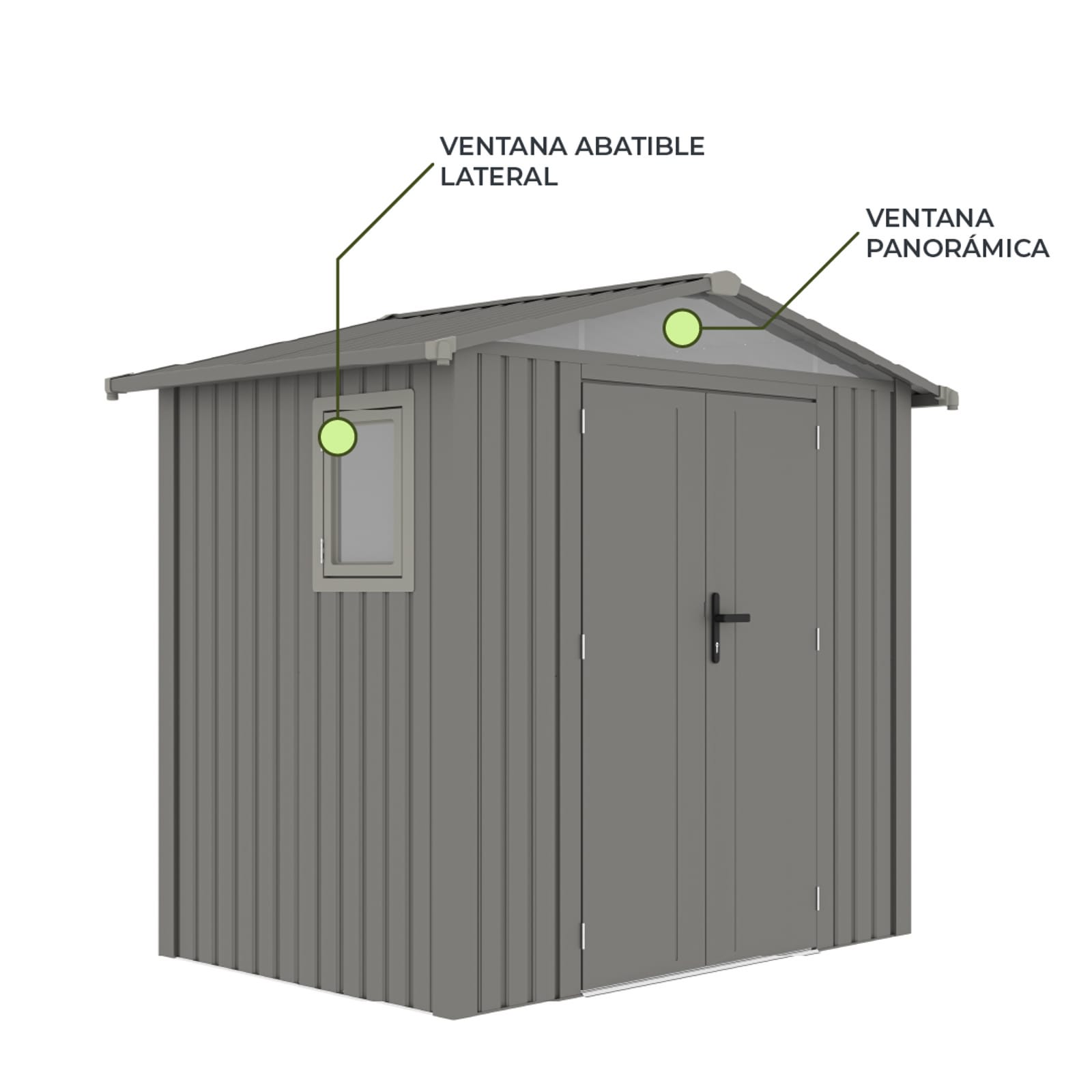 Su diseño a dos aguas te proporciona un techo resistente que evita la acumulación de lluvia. Las dos ventanas incorporadas, una panorámica para la entrada de luz natural y otra abatible de policarbonato en uno de sus laterales, ofrecen ventilación y visibilidad. Además, las puertas dobles frontales permiten el acceso fácil a equipos grandes como cortacéspedes y maquinaria de jardín, facilitado por una rampa integrada.