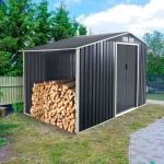 Su estructura reforzada con acero zincado y paneles laterales nervados no solo aportan estabilidad sino que también le confieren un aspecto moderno y atractivo. La puerta corredera doble facilita el acceso al interior, mientras que el anexo de almacenaje exterior te permite tener un espacio adicional para leña o cualquier otro elemento que necesites mantener a mano.