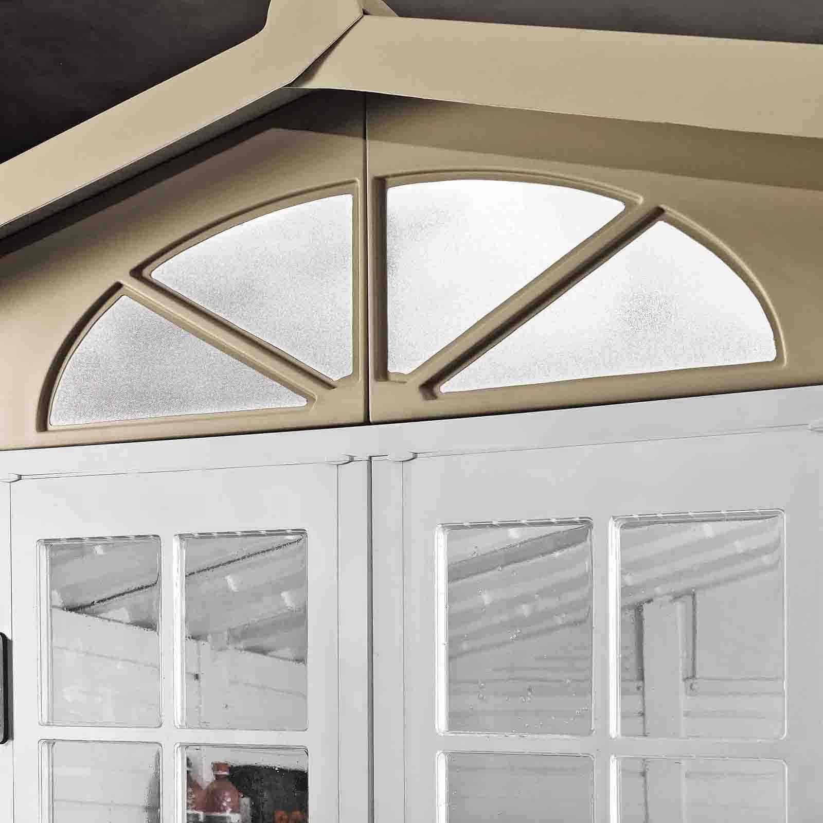 Su diseño moderno y funcional incluye dos puertas abatibles equipadas con ventanas frontales que permiten la entrada de luz natural, facilitando el acceso y mejorando la visibilidad del interior. La ventilación eficiente, gracias a los respiraderos integrados, evita la acumulación de humedad y mantiene un ambiente adecuado para tus herramientas o accesorios de jardín.