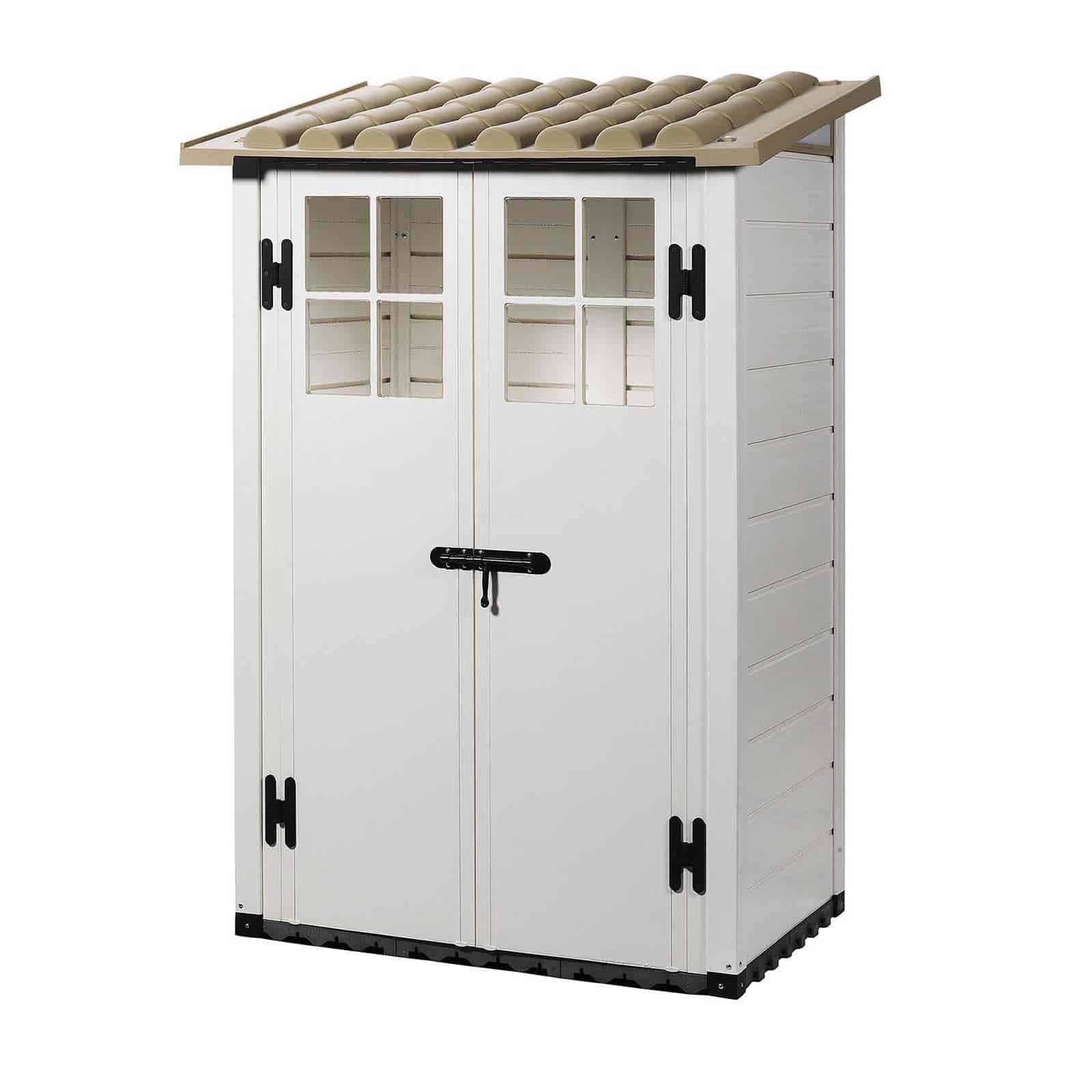 Nuestra caseta jardín Tuscany Evo 100 blanca ofrece un espacio seguro y elegante para guardar tus herramientas, juguetes o cualquier otro objeto que necesites proteger del clima. Fabricada con resina de polipropileno extrusionado de 21 mm de grosor, esta caseta está diseñada para resistir las variaciones climáticas y prolongar la vida útil de lo que almacenes dentro. Sus dos puertas abatibles ofrecen un acceso cómodo y amplio, mientras que las dos ventanas frontales permiten que la luz natural ilumine el interior.