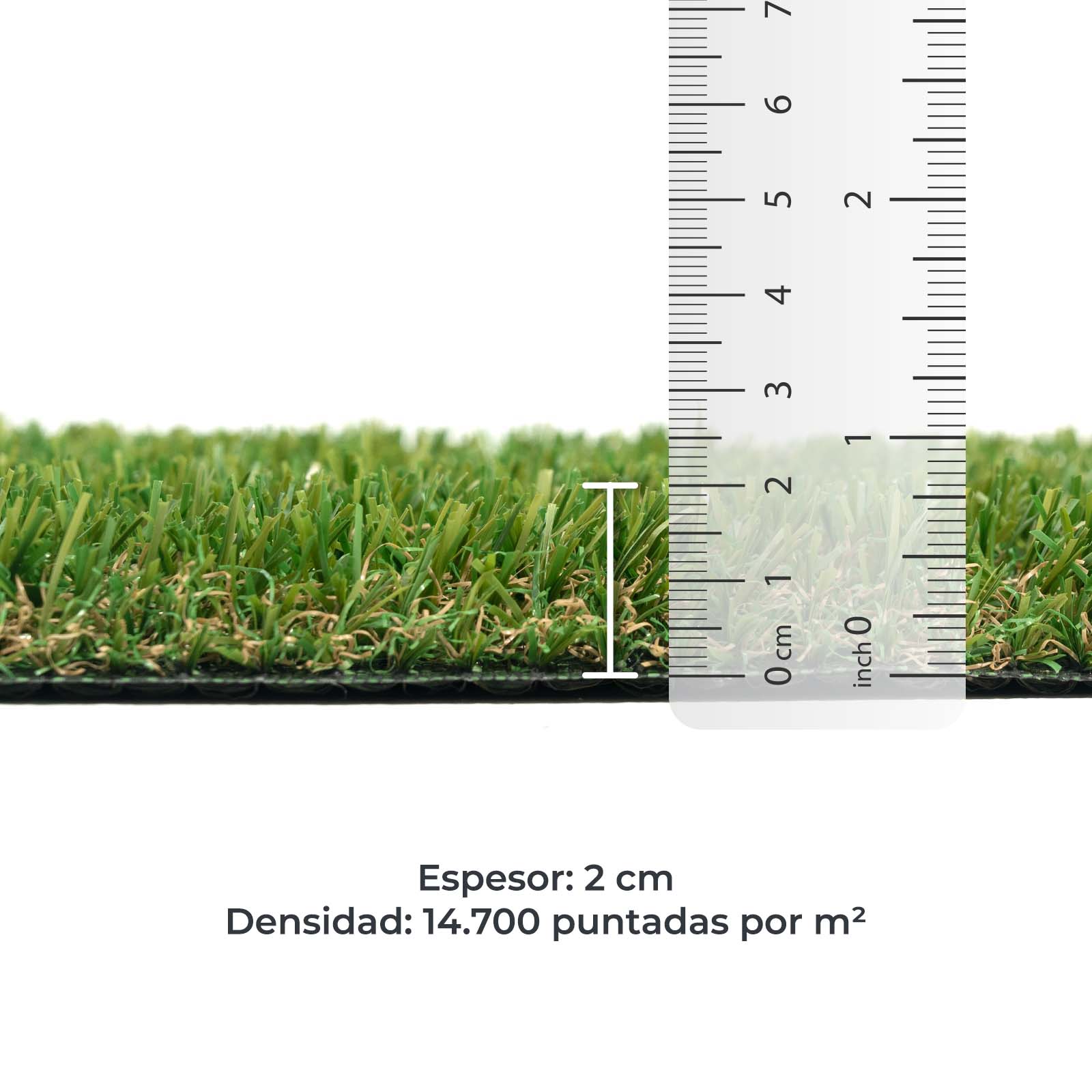 Con 14.700 puntadas por m², este césped artificial está diseñado para resistir el paso del tiempo y las actividades diarias. Su instalación es sencilla, ya sea utilizando grapas, piquetas, clavos o adhesivo, adaptándose perfectamente a la superficie de tu elección. Y lo mejor de todo, su mantenimiento es mínimo: olvídate de las horas dedicadas al riego y cuidados que requiere un césped natural.