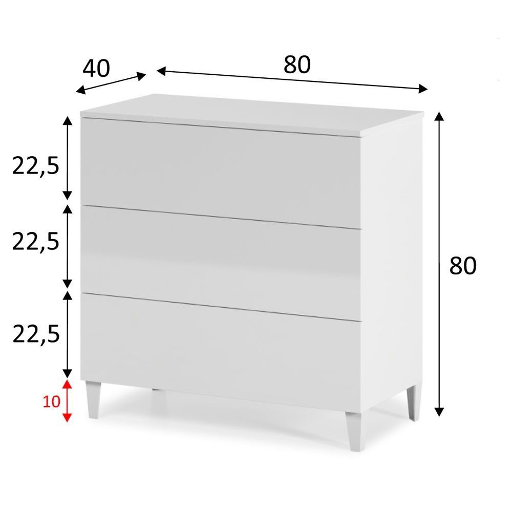Confort y diseño: Con un acabado en blanco brillo, esta cómoda se adapta perfectamente a cualquier estilo decorativo. Su altura de 80 cm (alto) x 80 cm (ancho) x 40 cm (fondo) ofrece una presencia sólida y elegante en tu dormitorio.