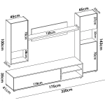 - Mueble Bajo de TV: Es el corazón de tu centro multimedia. Con sus dimensiones ideales (35 x 175 x 41 cm), ofrece un gran espacio para almacenamiento, con un hueco específico que incluye un orificio pasacables discreto. ¡Olvídate del desorden de cables y conecta tus dispositivos electrónicos sin complicaciones! Soporta televisores de hasta 55 pulgadas y un peso de hasta 50 kg.