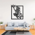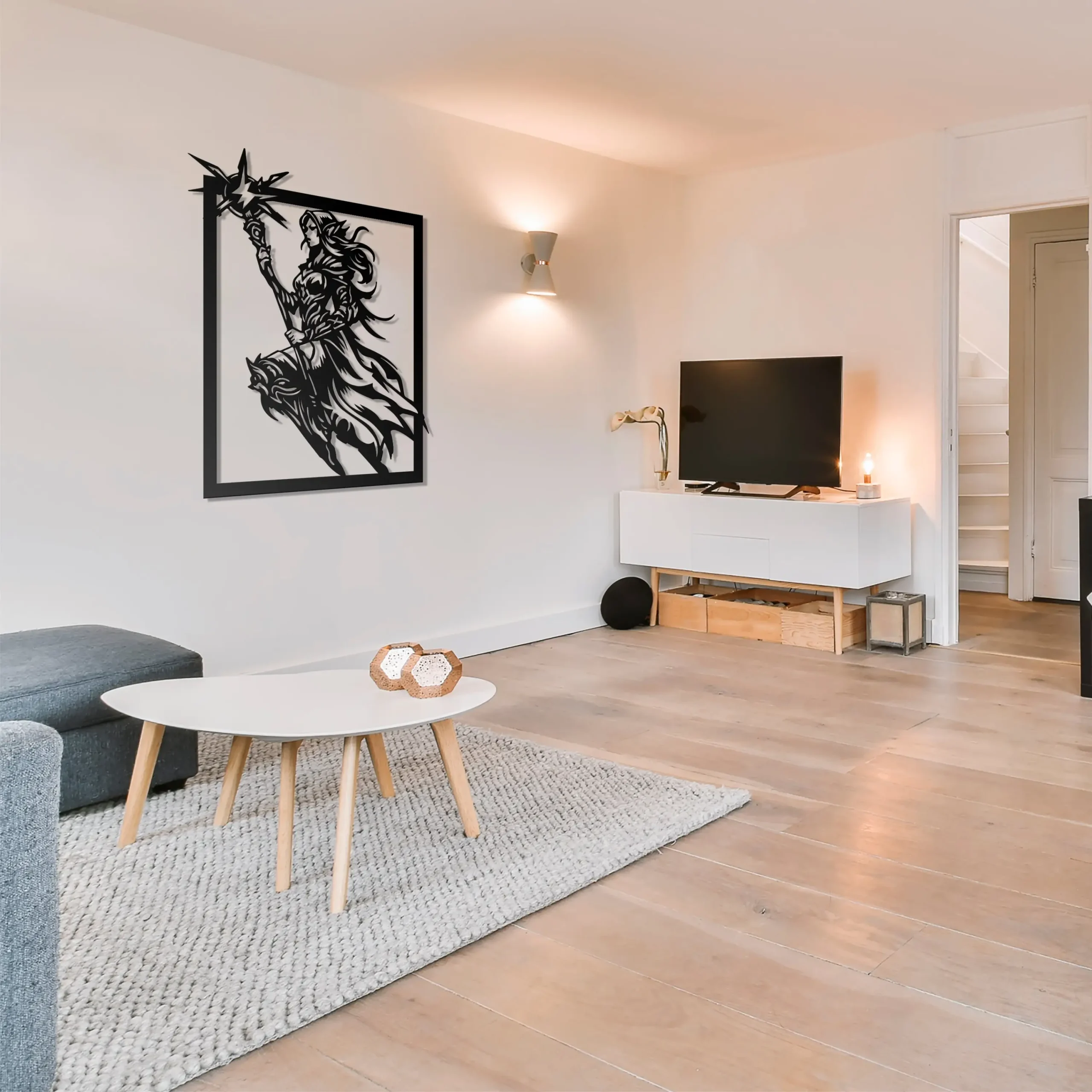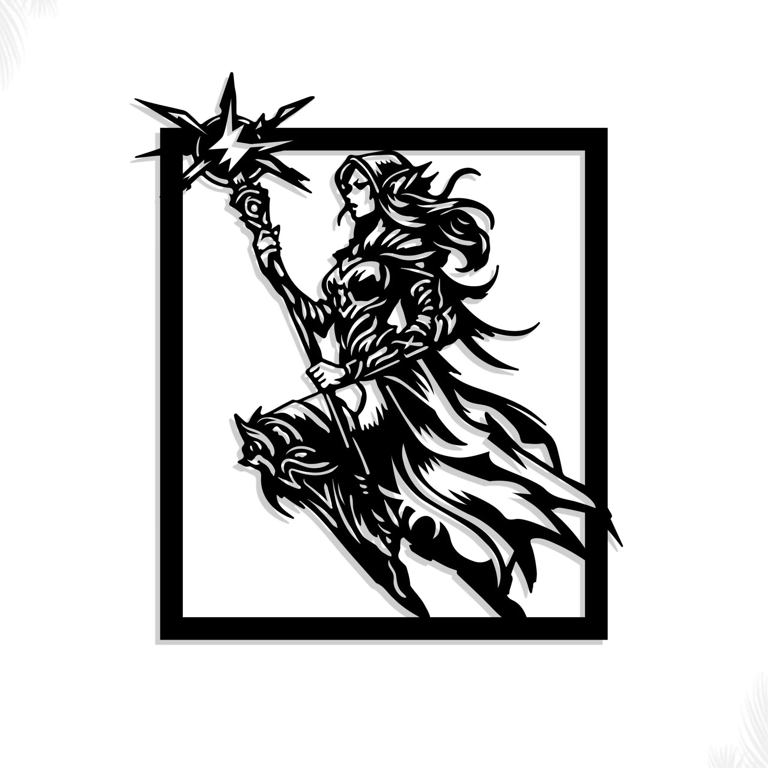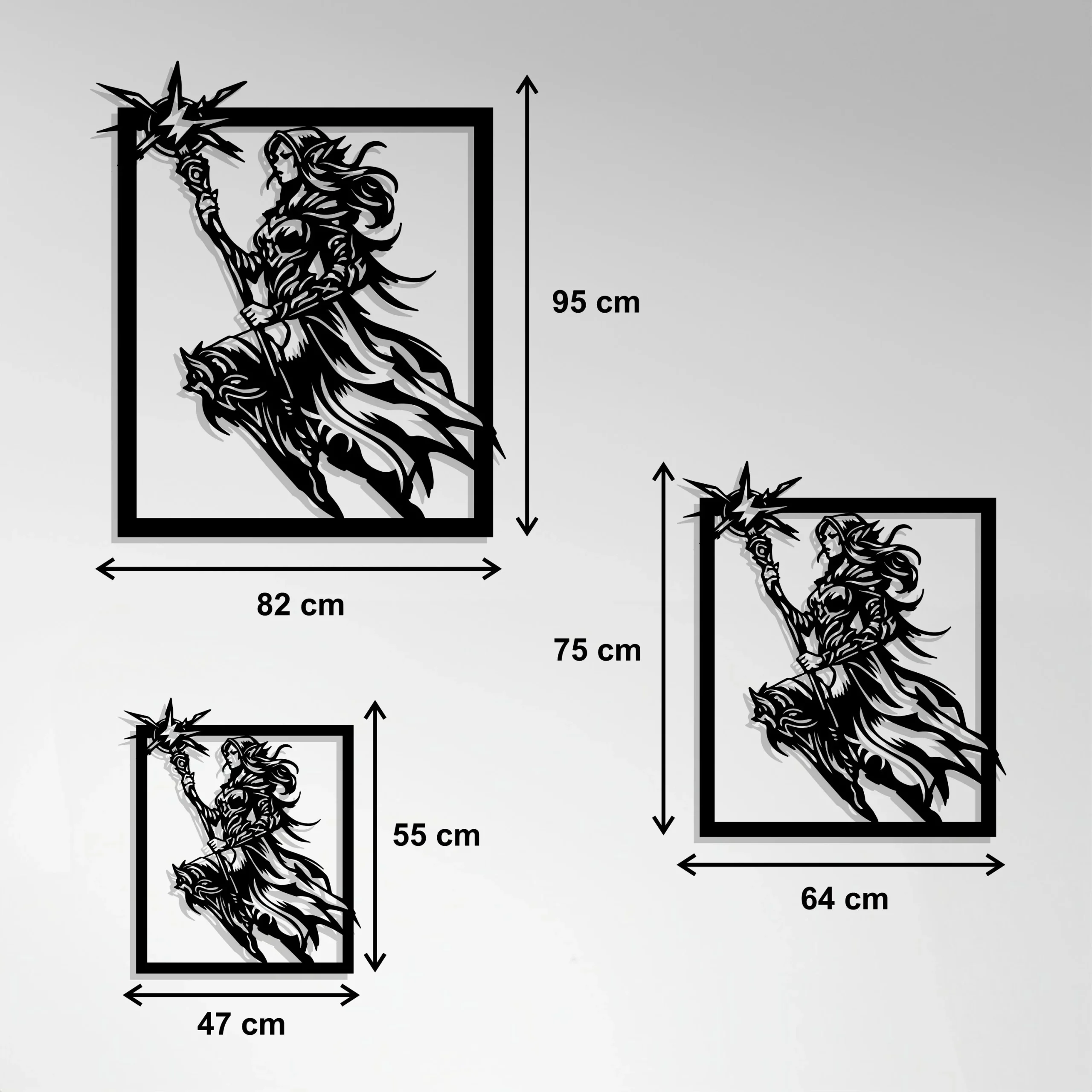 Esta obra de arte captura a la hechicera en pleno conjuro. Sus manos dibujan símbolos en el aire, su mirada es intensa y su silueta se recorta con una elegancia sobrenatural. Cada línea cortada en el metal es parte del encantamiento; las curvas de su túnica fluyen como energía mística y su postura denota un control absoluto sobre fuerzas invisibles.