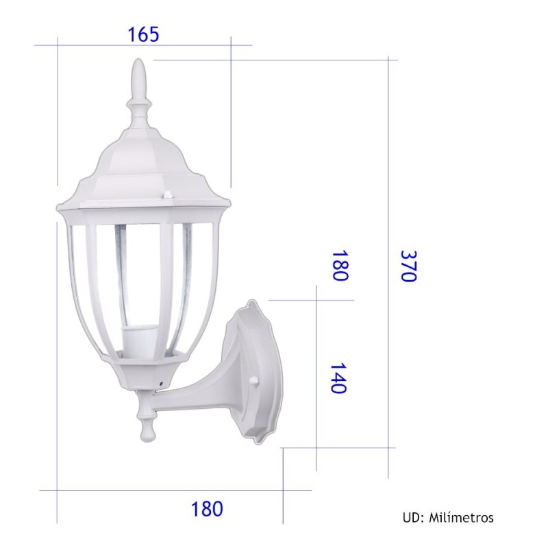 El farol de pared MICENAS, dispone de un casquillo con rosca E27 montado en la parte superior, de manera que no se moje al quedar protegido. Para bombillas LED, CFL o incandescencia (MAX 60W)