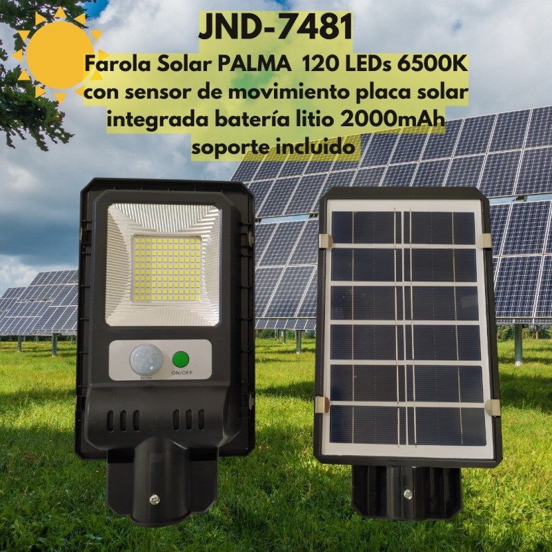 Farola Solar PALMA compacta 120 LEDs sensor de movimiento placa solar policristalina integrada y batería litio 2000mAh