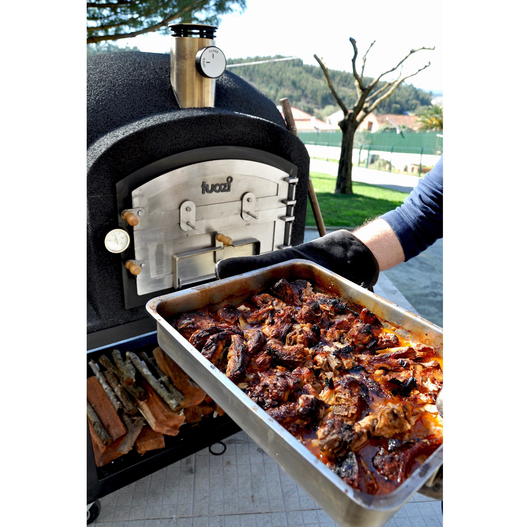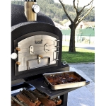 Equipado con termómetro integrado para controlar la temperatura precisa y una pequeña puerta de ventilación para regular el flujo de aire, este horno ofrece un control excepcional durante todo el proceso de cocción. La puerta de acero inoxidable 304 con doble apertura facilita el acceso al interior y el sistema de extracción de humo también de acero inoxidable 304 con diámetro de 125 mm garantiza una combustión limpia y eficiente. Además, cuenta con soporte para dos pinchos, ideal para cocinar carnes o verduras a la parrilla.