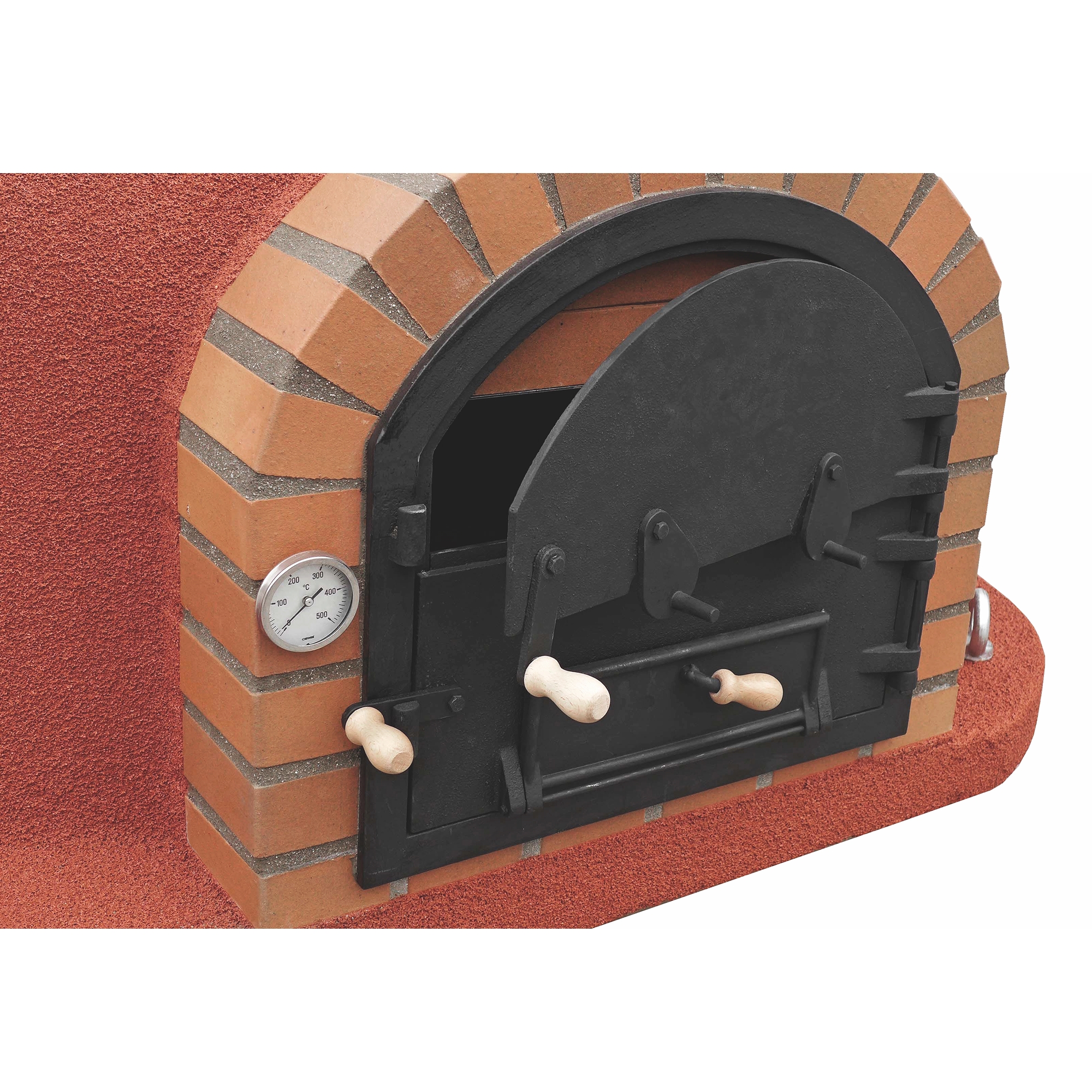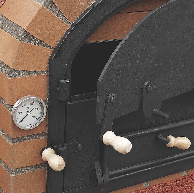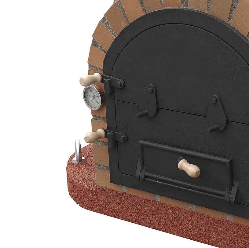 Puerta de acero fundido con doble apertura para facilitar el acceso a la zona de cocción.