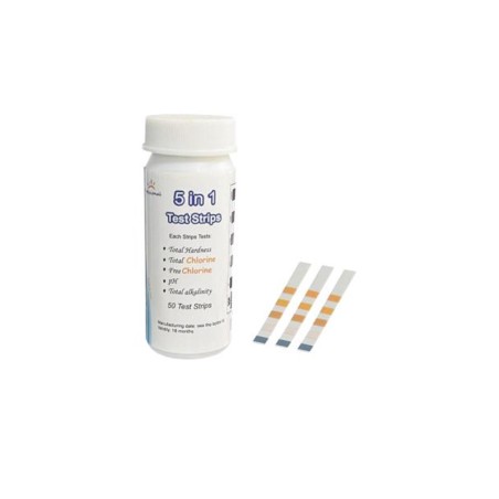 - Tiras reactivas para medir 5 parámetros esenciales: cloro libre, pH, alcalinidad total, estabilizador (ácido cianúrico) y dureza total.