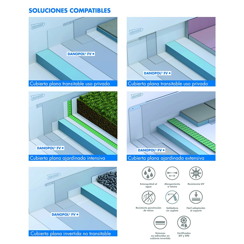 Durabilidad Extendida: La lámina impermeabilización PVC FV 1.2 está diseñada para resistir las condiciones climáticas más adversas, garantizando años de protección sin necesidad de reemplazo o reparación frecuente.