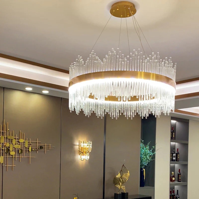 Transforme su espacio con la elegante lámpara MILDA, una combinación perfecta de metal dorado brillante y cristales decorativos verticales que añaden un toque de lujo a cualquier ambiente.