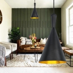 Lampara de techo Trompeta redonda, diámetro 18cm de color negro por el exterior y dorada por el interior con casquillo E27 soporte de techo y cable negro.