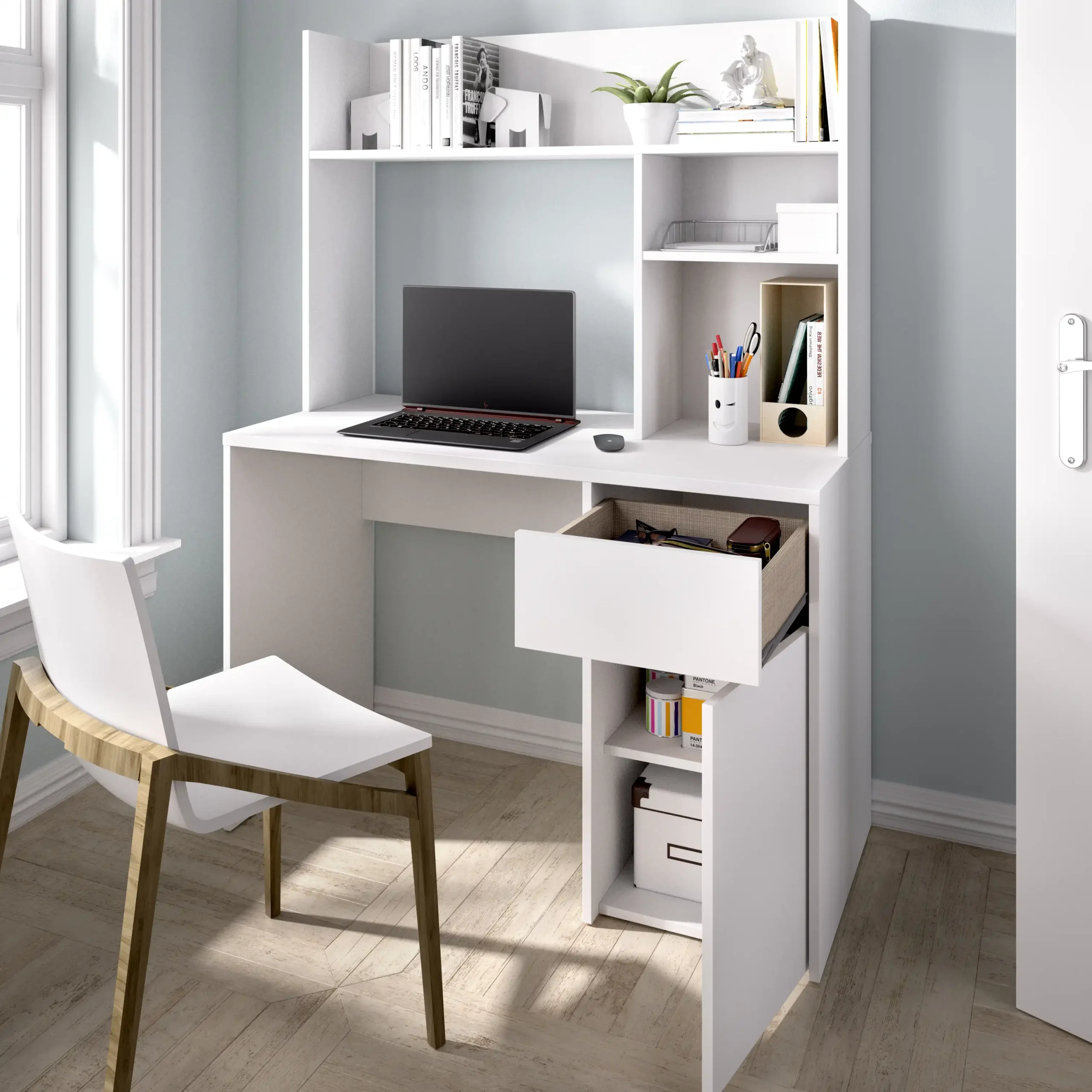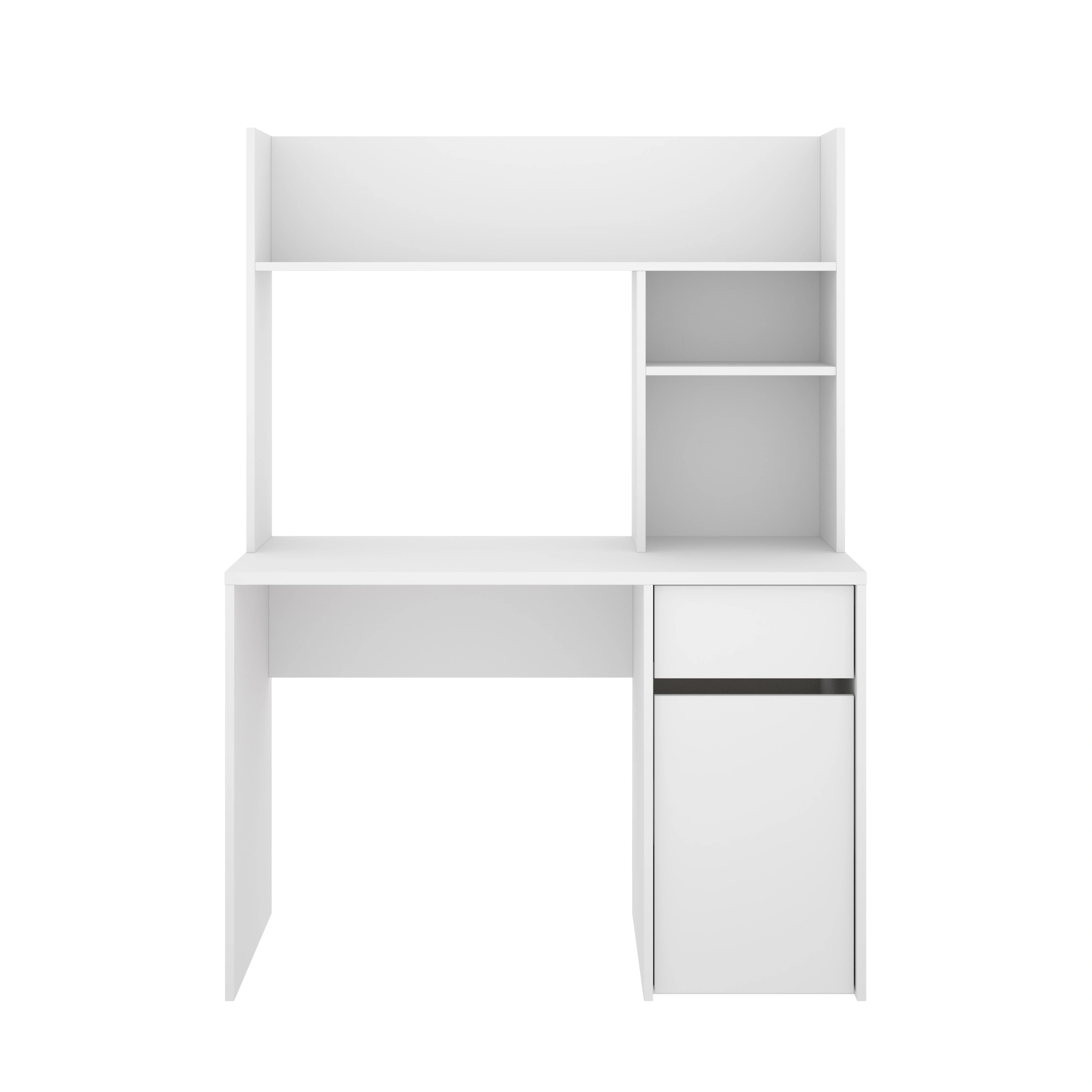 - Mueble Lateral con Puerta y Estantes: A un lado del escritorio, encontrarás una puerta que oculta dos huecos interiores, perfectos para libros o archivadores.