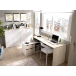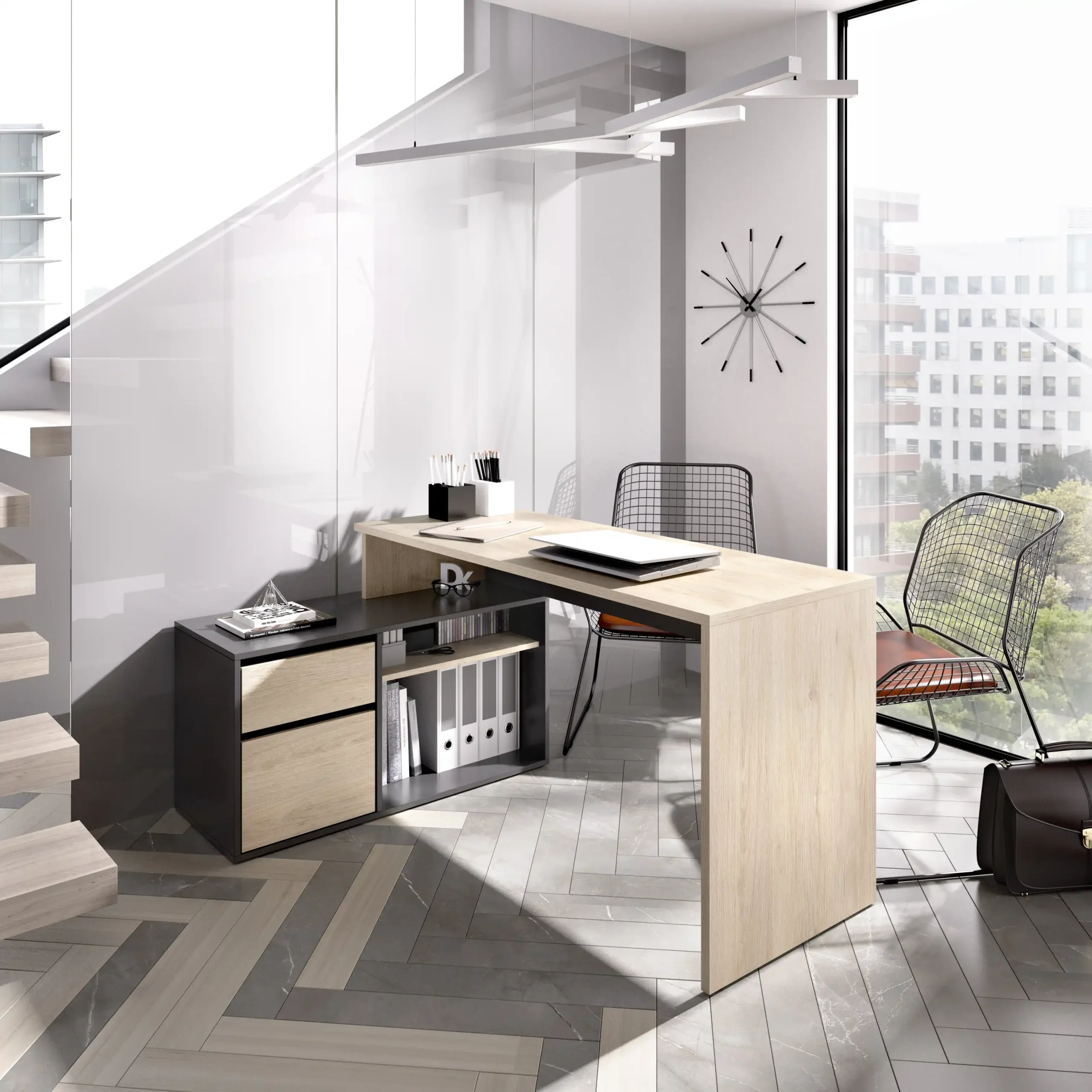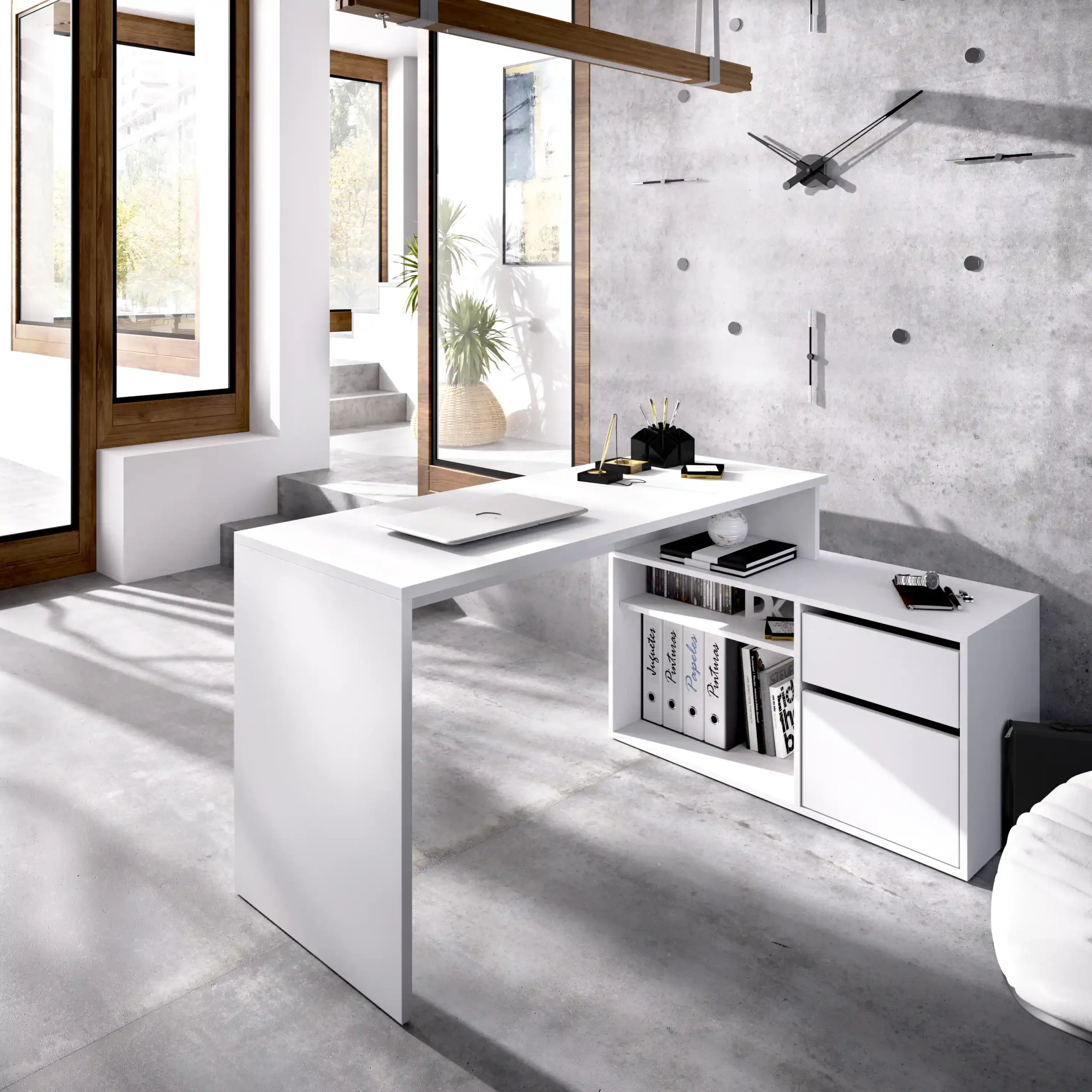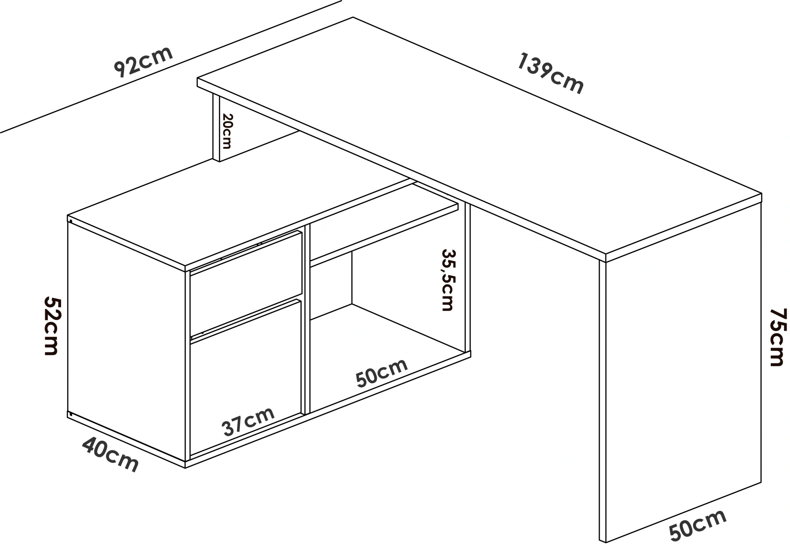 - Configuración en L: Ideal para aprovechar las esquinas, con unas dimensiones de 75 cm x 139 cm x 92 cm. Te ofrece un amplio espacio de trabajo y almacenamiento a la mano, creando un rincón productivo y cómodo.