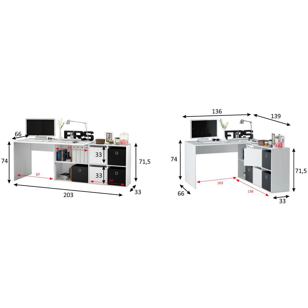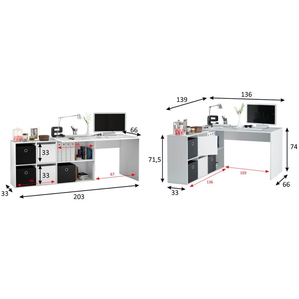 - Mesa angular: 74 cm (alto) x 136 cm (ancho) x 139 cm (fondo)