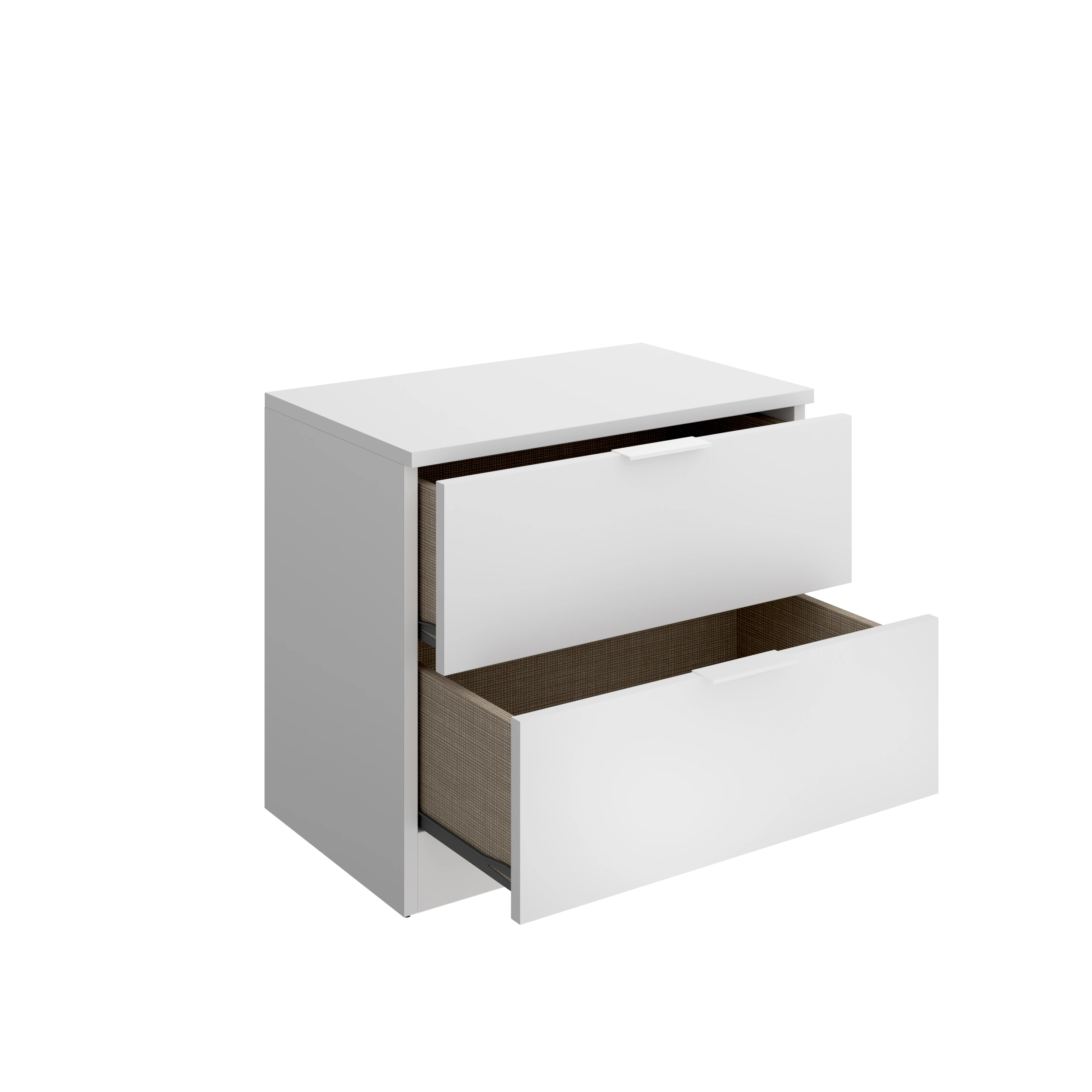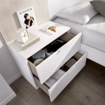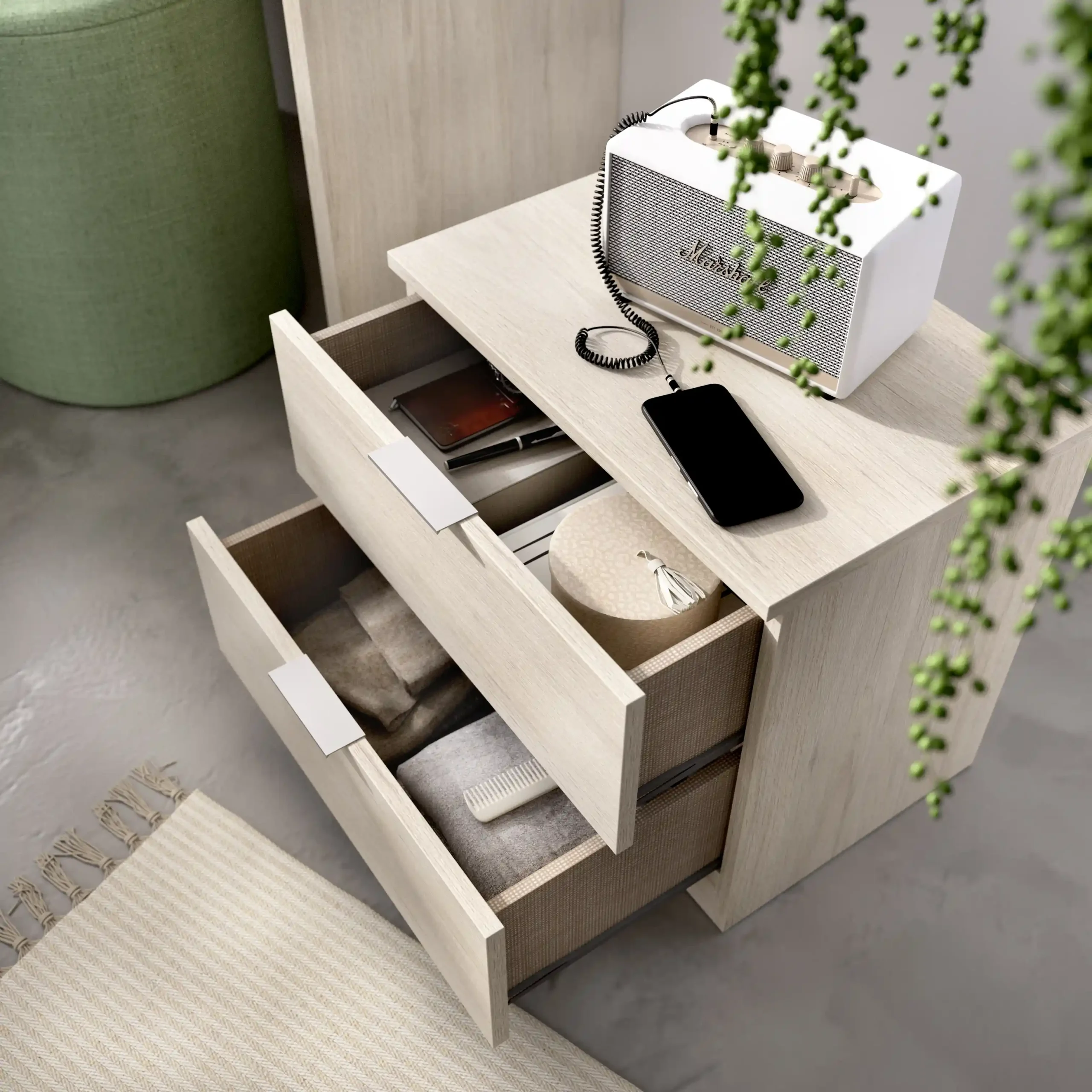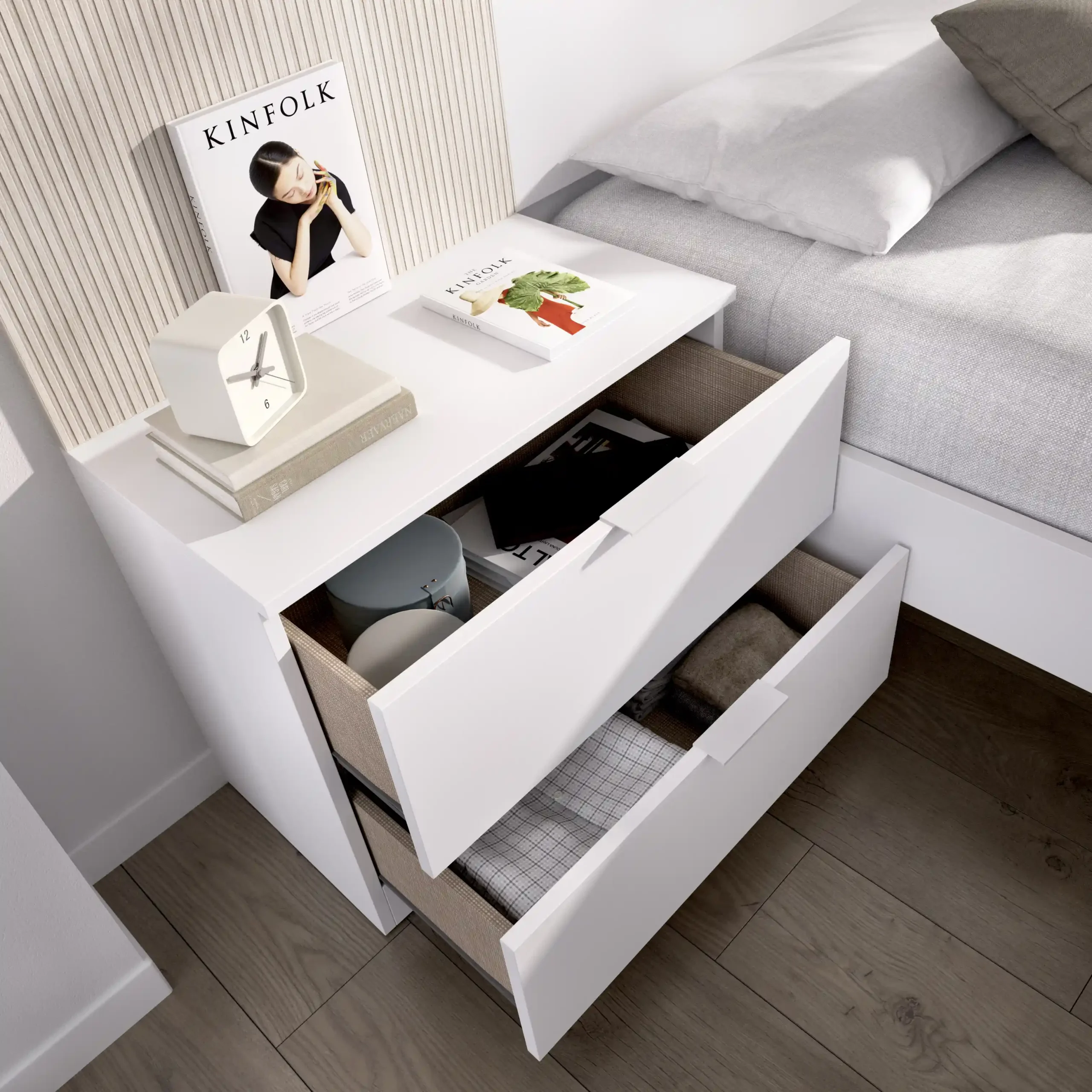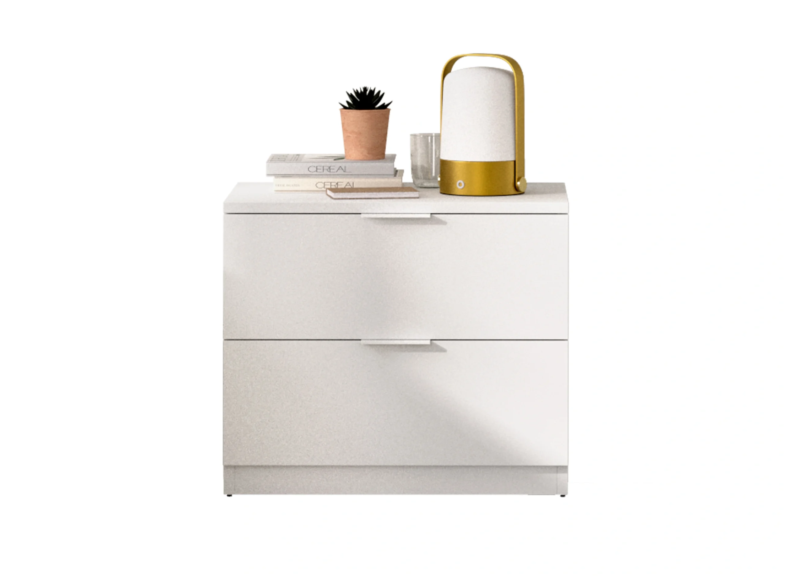 Con sus dos amplios cajones de almacenamiento, la Mesita de Noche LAGO es perfecta para: